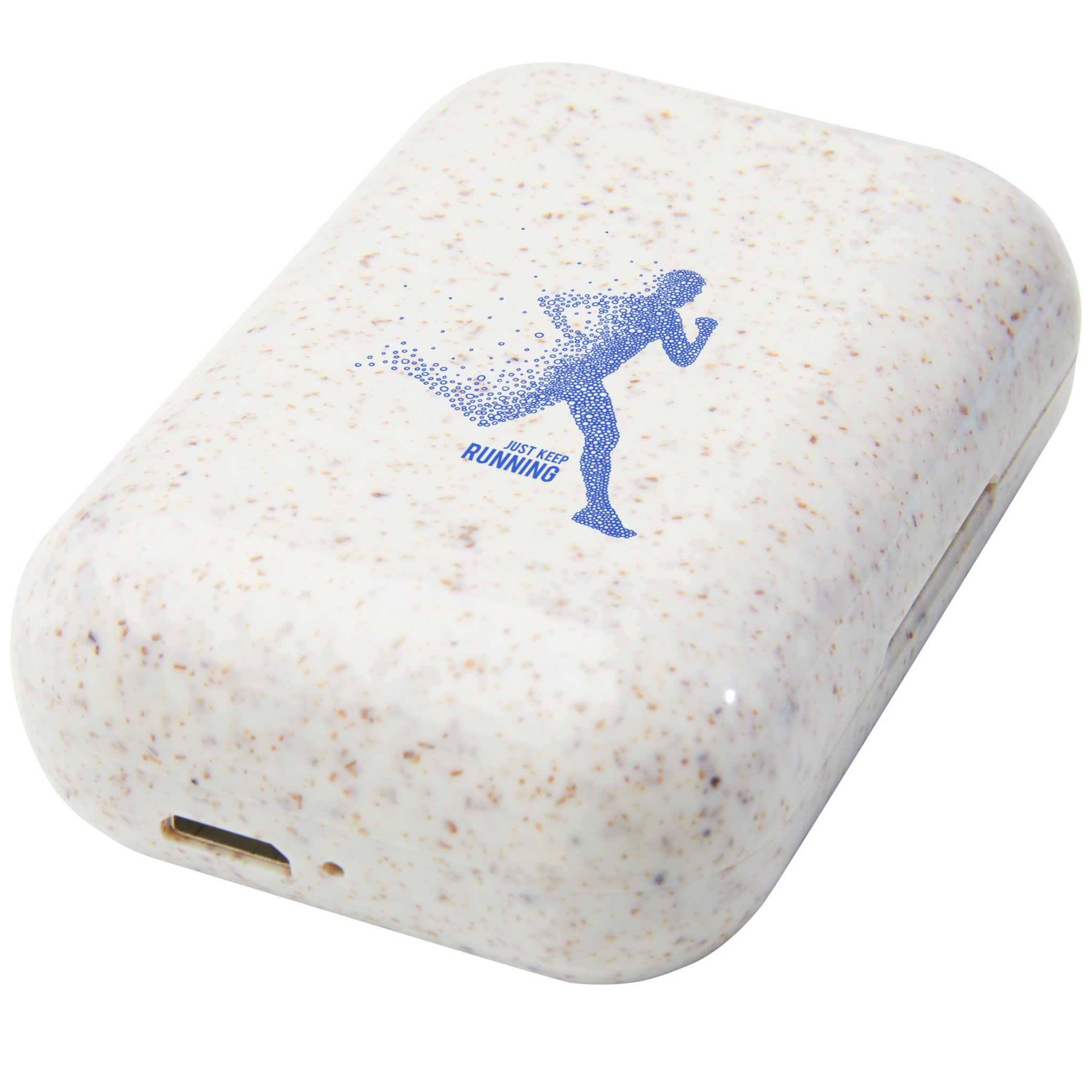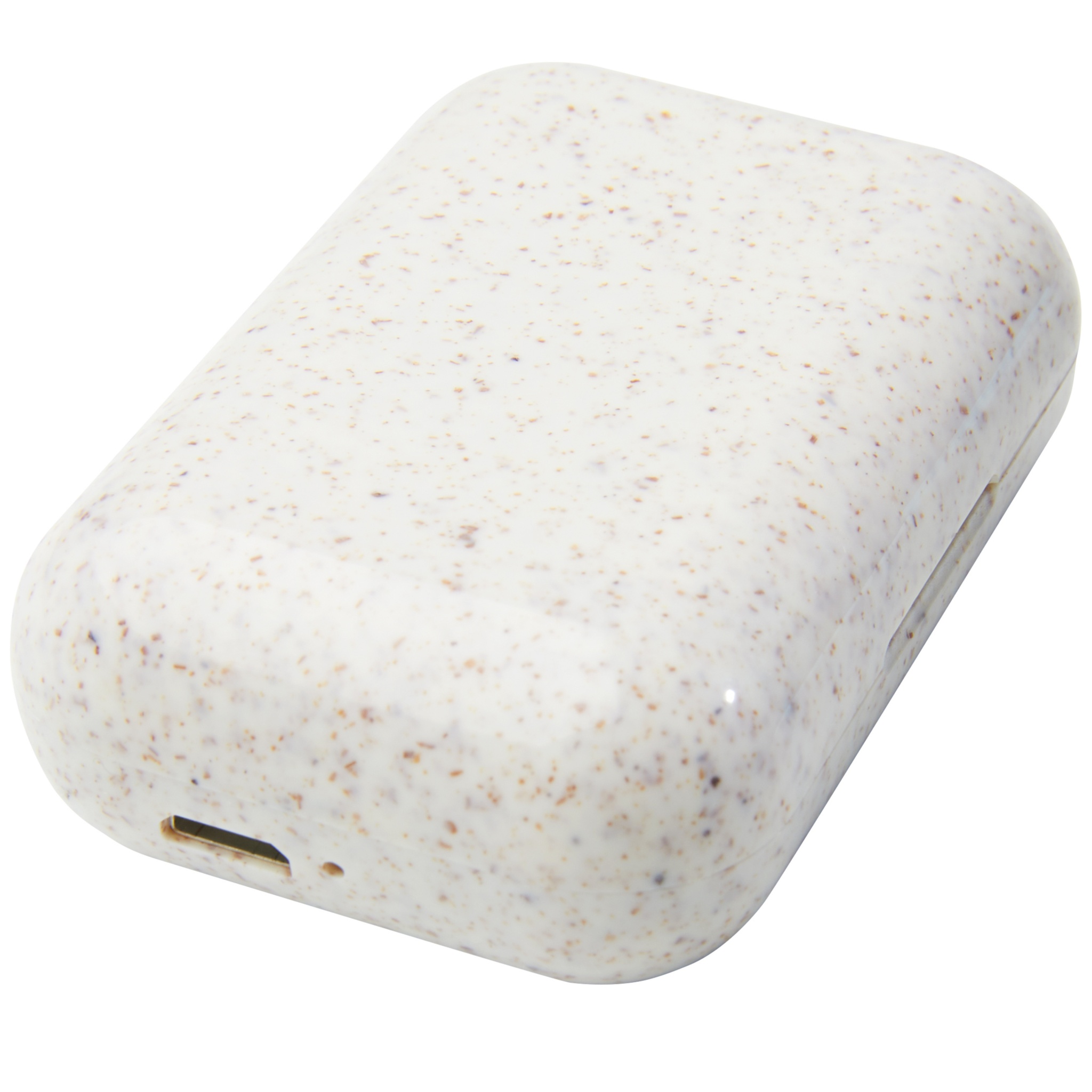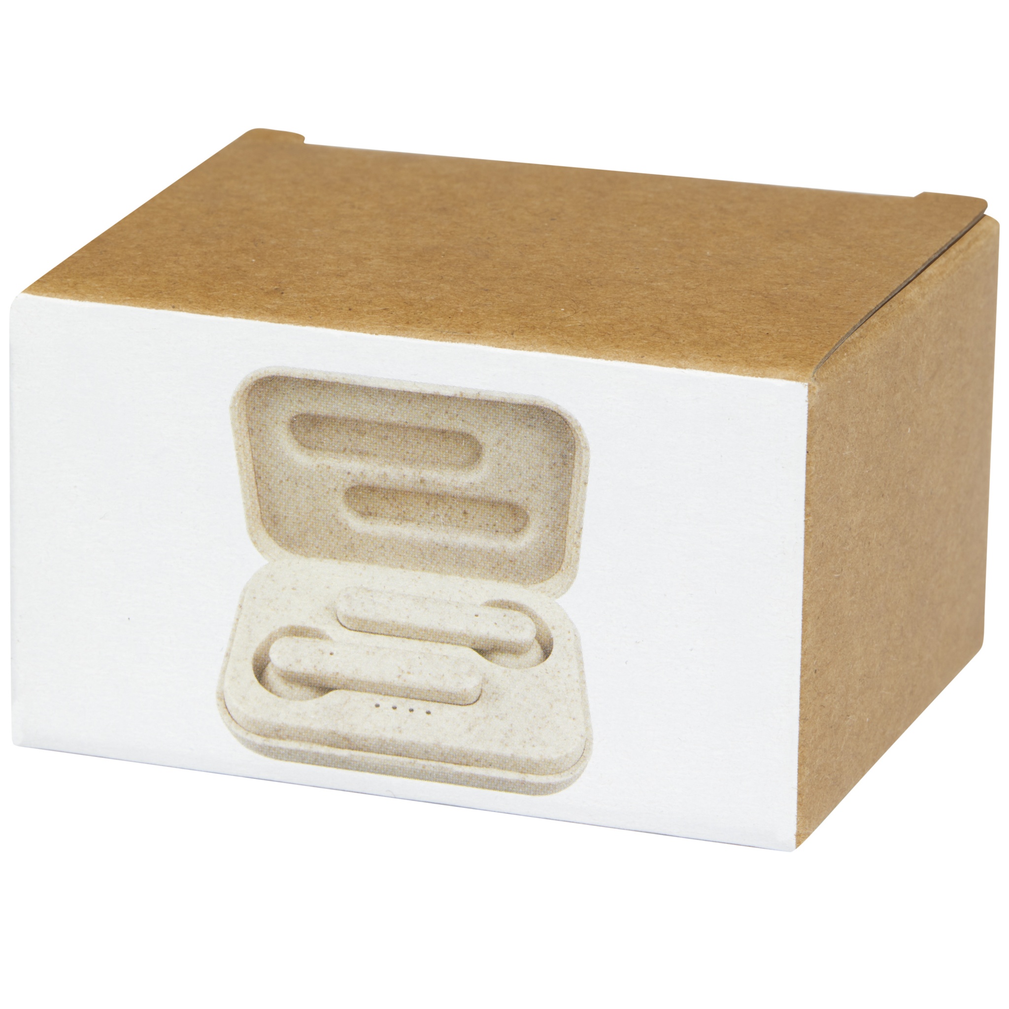 True Wireless stereokõrvaklapid, mis on valmistatud nisukõrrest plastikust, vähendades vajaliku plasti kogust. Sisseehitatud multifunktsionaalne nupp kõigi funktsioonide juhtimiseks: sisse/välja lülitamine, vastamine/kõne katkestamine, esitamine, paus, järgmine/eelmine lugu, helitugevuse suurendamine/vähendamine, hääleabi aktiveerimine. Bluetooth® 5.0 ulatusega kuni 10 meetrit. Toitekapsel suudab laadida kõrvaklappe 0 kuni 100% vähemalt 3 korda. Taasesitusaeg on maksimaalse helitugevusega kuni 2 tundi ja kõrvaklapid saab täis laadida 1 tunniga. Tarnitakse kinkekarbis koos kasutusjuhendiga (mõlemad säästvast materjalist).