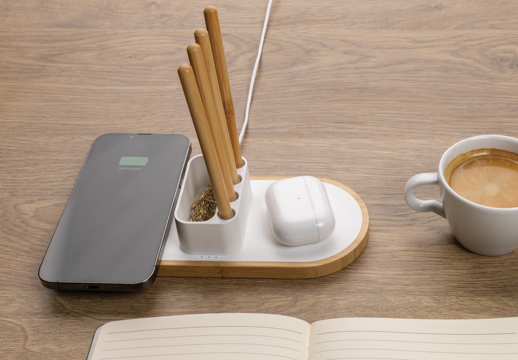 Kahekordne 10 W kiire juhtmevaba laadija koos pliiatsihoidjaga, mis on valmistatud RCS (Recycled Claim Standard) sertifitseeritud taaskasutatud ABS-ist. Taaskasutatud kogusisaldus: 31% eseme kogukaalust. RCS-sertifikaat tagab taaskasutatud materjalide täielikult sertifitseeritud tarneahela. Põhi on valmistatud FSC® 100% bambusest. Juhtmeta laadimine ühildub Androidi uusimate põlvkondade, iPhone 8 ja uuemate versioonidega. Saab laadida kahte telefoni korraga või laadida mis tahes muud juhtmevaba seadet. 4 pliiatsiauguga pliiatsite/pliiatsite hoidmiseks ja väikese hoiukohaga visiitkaartide või muude väikeste esemete hoidmiseks. Toode ja tarvikud PVC-vaba. Kaasa arvatud 120 cm C-tüüpi laadimiskaabel, mis on valmistatud RCS-sertifikaadiga taaskasutatud TPE-st. Pakitud FSC®mix kraftkarpi. Type-C in; Sisend 5V/2A; 9V/2A; Juhtmeta väljund 5V/1A;9V/1,1A; (10W) Registreeritud disain®