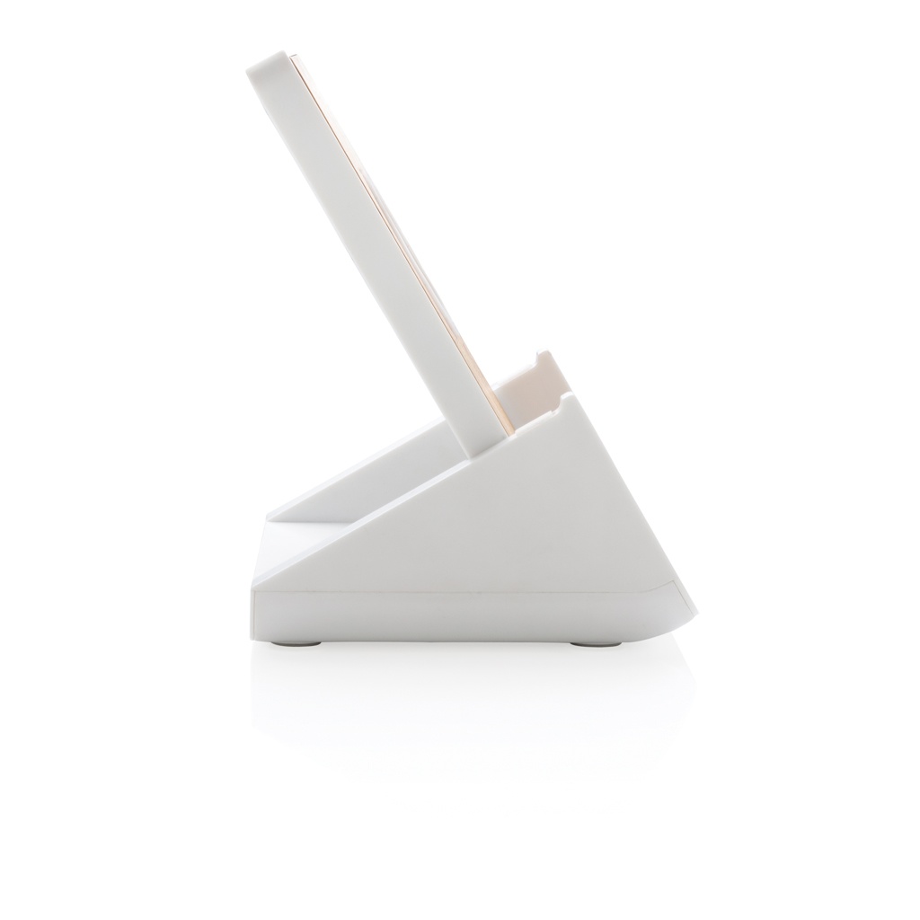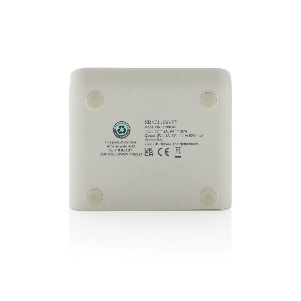 10 W kiire juhtmevaba laadija, mis on valmistatud RCS (Recycled Claim Standard) sertifitseeritud taaskasutatud ABS-ist. Taaskasutatud kogusisaldus: 47% eseme kogukaalust. RCS-sertifikaat tagab taaskasutatud materjalide täielikult sertifitseeritud tarneahela. Bambusest FSC 100 bambusest valmistatud juhtmevaba laadimisala. Kahe USB-pordiga tagaküljel laadimiseks kaabli kaudu. Alus on mõeldud telefoni laadimiseks nii horisontaal- kui ka vertikaalasendis. See muudab laadimise ajal ideaalseks videote või muu sisu vaatamiseks. Juhtmeta laadimine ühildub Androidi uusimate põlvkondade, iPhone 8 ja uuemate versioonidega. Toode ja tarvikud PVC-vaba. Kaasa arvatud 120 cm C-tüüpi laadimiskaabel, mis on valmistatud RCS-sertifikaadiga taaskasutatud TPE-st. Pakitud FSC mix kraft karpi. Type-C sisend 5V/2A; 9V/2A; Juhtmeta väljund 5V/1A;9V/1,1A; (10W) Registreeritud disain®