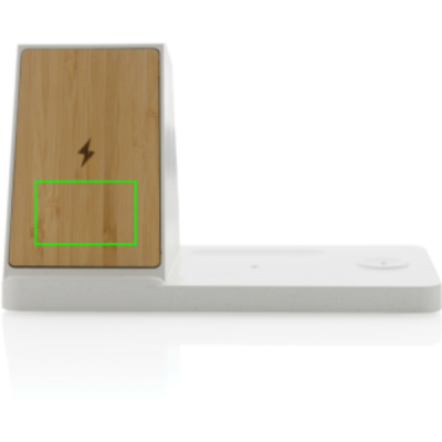 15 W kolm-ühes kiire juhtmevaba laadija koos pliiatsihoidjaga, mis on valmistatud RCS-i (Recycled Claim Standard) sertifitseeritud taaskasutatud ABS-st. Taaskasutatud kogusisaldus: 73% eseme kogukaalust. RCS-sertifikaat tagab taaskasutatud materjalide täielikult sertifitseeritud tarneahela. Bambusest juhtmevaba laadimisala, mis on valmistatud FSC 100% bambusest. Kahe spiraaliga 15 W laadija ja üks 5 W laadija muude juhtmevabalt laetavate esemete (nt kõrvaklapid ja 2,5 W kellalaadija) jaoks. Ühe USB A pordi ja ühe USB C tagaküljel laadimiseks kaabli kaudu. Juhtmeta laadimine ühildub Androidi uusimate põlvkondade, iPhone 8 ja uuemate versioonidega. Toode ja tarvikud PVC-vaba. Kaasa arvatud 120 cm C-tüüpi laadimiskaabel, mis on valmistatud RCS-sertifikaadiga taaskasutatud TPE-st. Pakitud FSC mix kraft karpi. 9V/3A; W: 9 V/1,1 A; 9V/1,67 A/(15W), kõrvaklapid: 5V/1A (5W), käekell: 5V/0,5A (2,5W), USB/C-tüüpi väljund: 5V / 2,1A. Registreeritud disain®