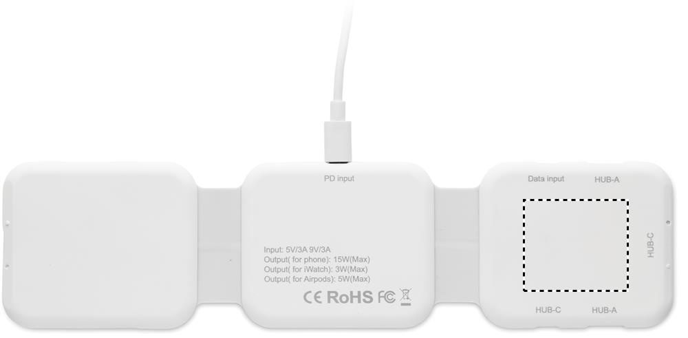 Magnetiline laadimisjaam ABS-plastist. 3 juhtmevaba laadimiskohaga. 1 x 15 W, 1 x 5 W TWS-i jaoks ja 1 Apple Watchi laadija (3 W). 2 Type-C ja 2 USB-A jaoturit. Integreeritud kaabli sisend: Type-C ja USB-A ühenduspesa.