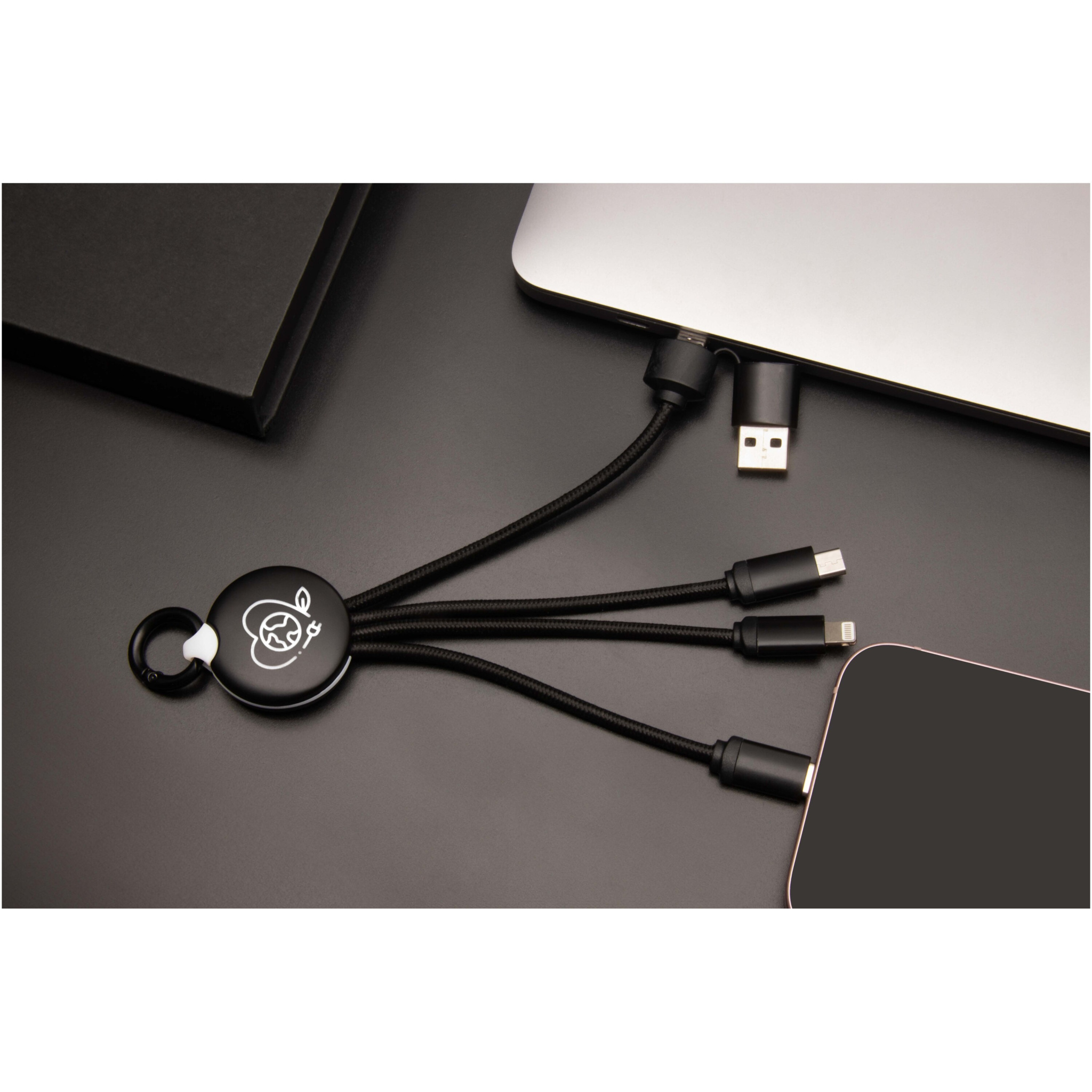 Viis-ühes laadimiskaabel 3 pistikuga (C-tüüp, Android, iPhone) ja rPET-juhtmed (valmistatud taaskasutatud plastpudelitest). Tänu kahele USB-A + USB-C sisendile ühildub kaabel 100% turul uusimate arvutitega (USB-C). Otsakatete metallilise välimusega viimistlus. Kaabliga saab korraga laadida kuni 3 seadet. Tarnitakse taaskasutatavas ümbrises ja taaskasutatud paberkaardis.