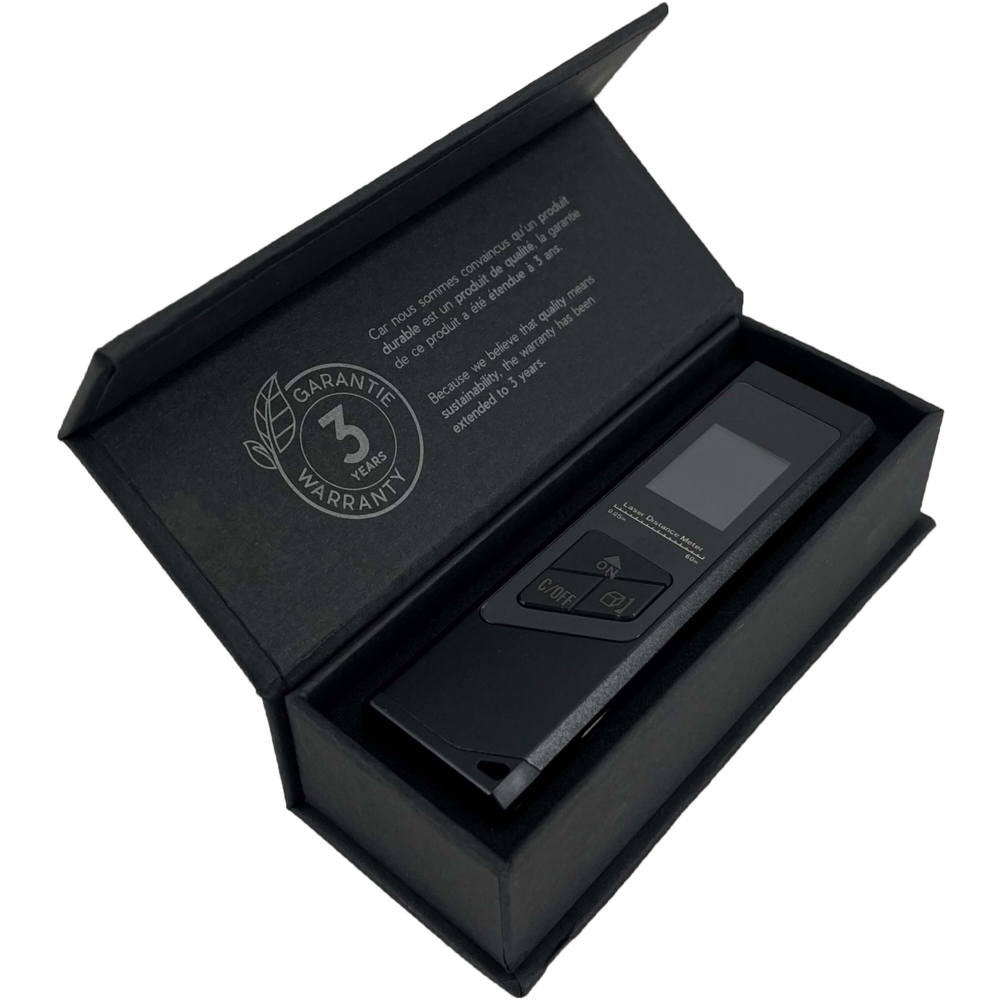 Mini lasertelemeeter on lihtsam, kiirem ja täpsem viis pindala, ruumala mõõtmiseks ning sellel on ka Pythagorase funktsioon. Tänu laser-täppistehnoloogiale ja reaalajas mõõtmisrežiimile võimaldab see usaldusväärseid mõõtmisi teha kuni 40 meetrit. Telemeeter kasutab toiteallikana energiasäästlikku 200 mAh liitiumioonakut ja suudab pärast täislaadimist mõõta vahemaad 2000 korda. Sellel on taustvalgustusega ekraan, mis võimaldab hõlpsalt vaadata isegi pimedas. Mõõdud: 9 x 2,4 x 1,1 cm. Pakitud magnetkinnitusega taaskasutatud paberist kinkekarpi (10,2 x 4,2 x 3 cm). Sisaldab 3-aastast garantiid.