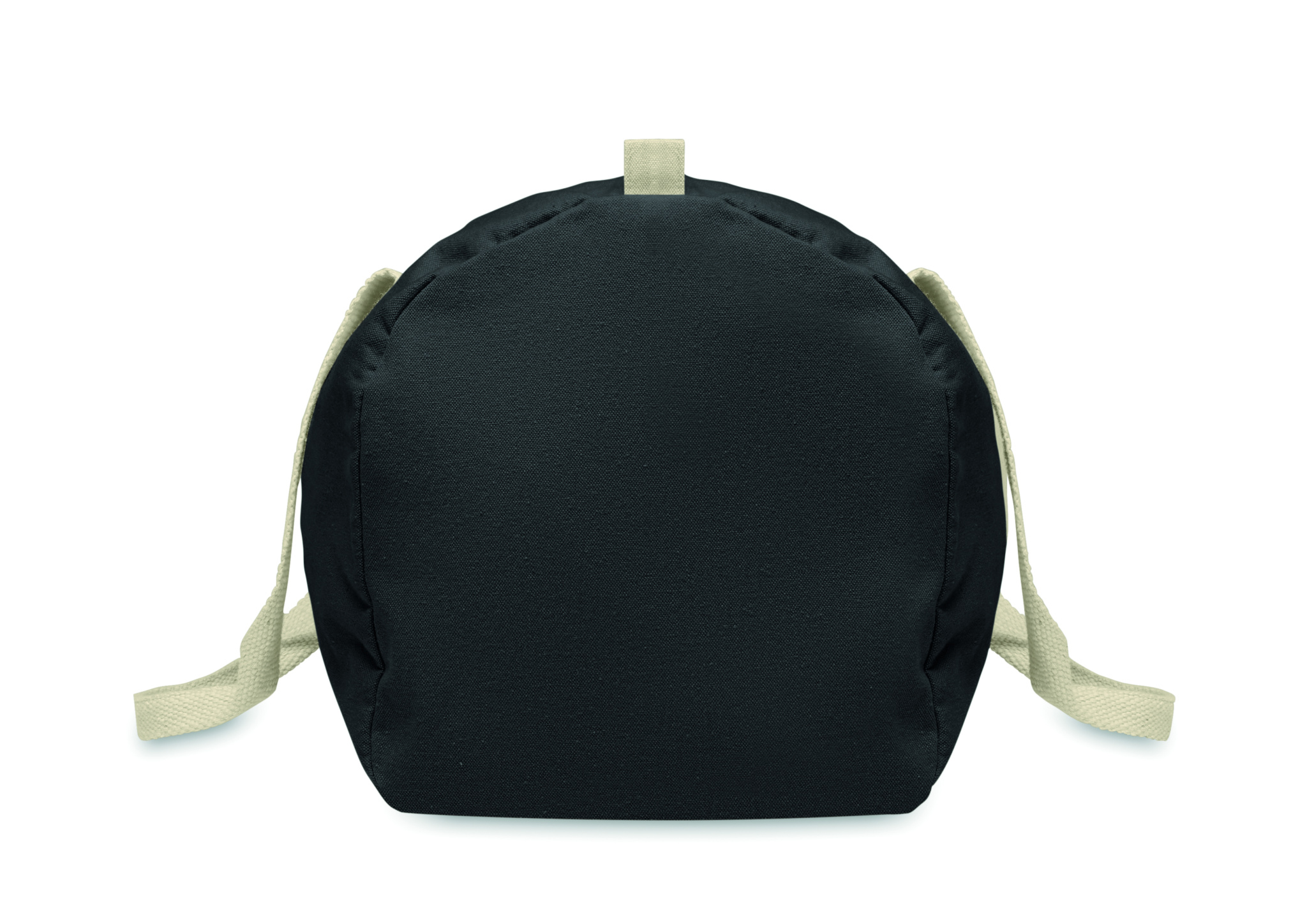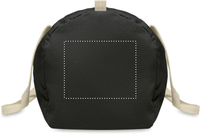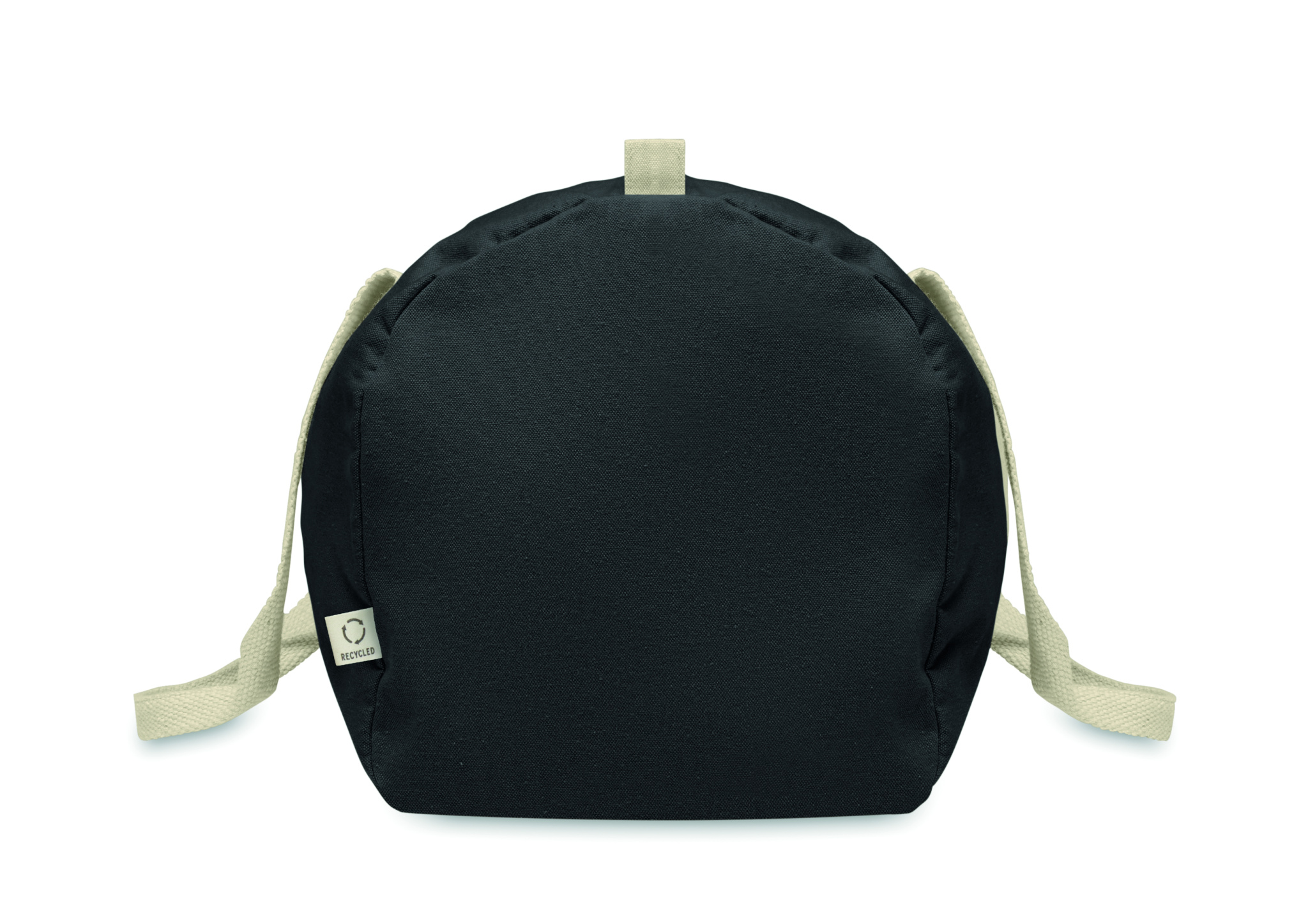 Must pikkade sangadega 320 gr/m² taaskasutatud puuvillast (80%) ja taaskasutatud polüestrist (20%) tõmblukuga küljesahtli ja lukuga sisetaskuga kott, spordi- või reisikott.