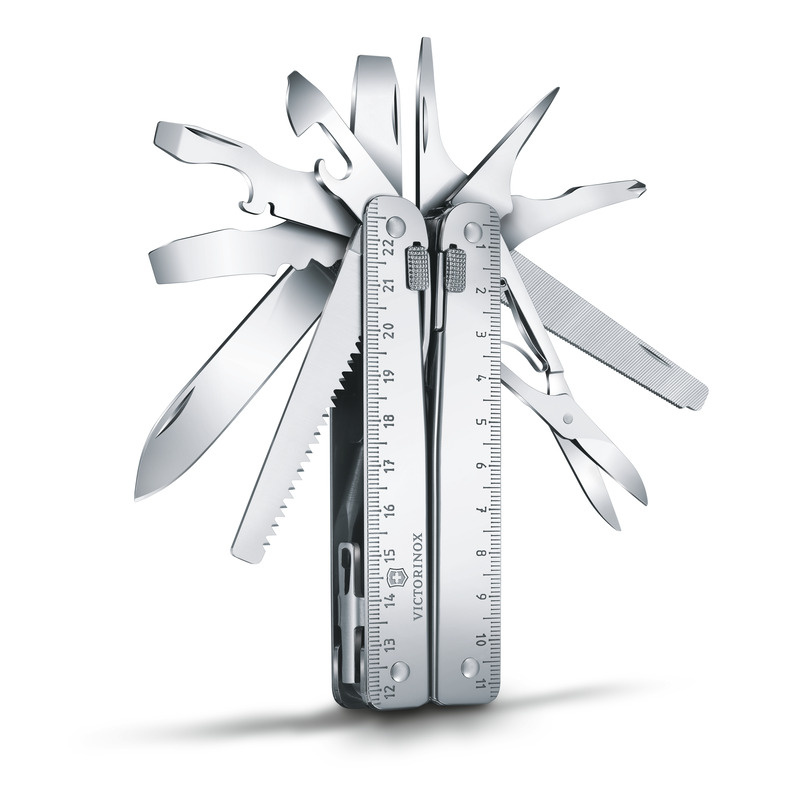 Swiss Tool X on pakkumine neile, kes otsivad midagi enamat kui taskunuga. See on terve komplekt tööriistu, mis on paigutatud ühte elegantsesse korpusesse, millel on hästi läbimõeldud disain. Tööriistaga on kaasas nahkkohver.Spetsifikatsioon: 1. vardas 2. tangid 3. 2 mm kruvikeeraja 4. 3 mm kruvikeeraja 5. traadilõikur 6. 5 mm kruvikeeraja 7. pudeliavaja 8. 7,5 mm kruvikeeraja 9. tera 10. käärid 11. metallviil 12. rauasaag 13. puidusaag 14. 1-2 tärni kruvikeeraja 15. peitel 16. kastiavaja 17. traadi painutusseade 18. isolatsioonieemaldaja 19. traadilõikur 20. konserviavaja 21. mõõtetops (23 cm) 22. mõõdulint (9 tolli) 23. elektrikaabli pressija 24. rihmaaasaga nahkkohver 25. karastatud traadilõikur 26. kinnitusaas 27. 12 eraldi vedru 28. lukuvabastus 29. pistikupesa konteiner 30. pesa võti - pistikupesad kaasas: 31. väike mutrivõti - kaasas olevad pesad: 32. - Kuuskant 3 33. - Kuuskant 4 34. - Phillips 0 35. - Phillips 3 36. - Torx 10 37. - Torx 15 38. koht lisapesa jaoks 39. ruumi jaoks lisapesa 40. korgitser 41. minikruvikeerajaL2 - graveering terale L3 - graveering kaanel