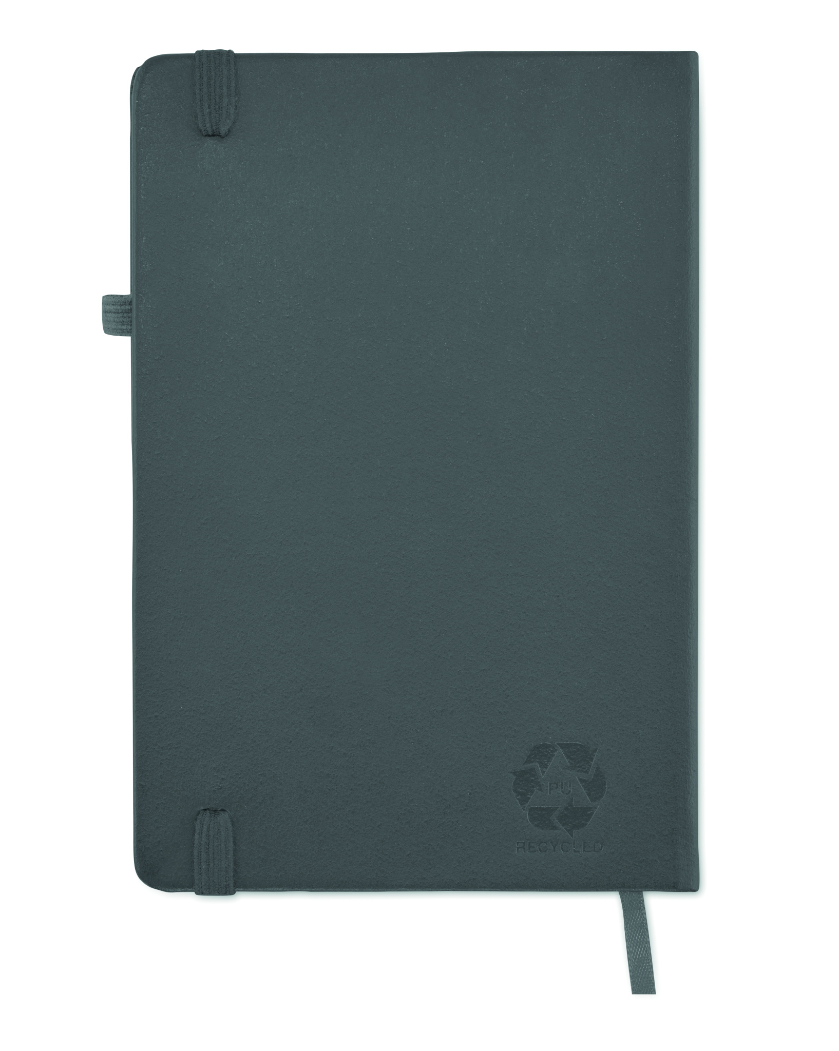 A5-formaadis sülearvuti 70% taaskasutatud nahast ja 30% lateksist PU kaanega. Casebound. 192 joonega lehekülge taaskasutatud paber (96 lehte). Sobiv elastne sulgemisrihm ja pliiatsihoidja.