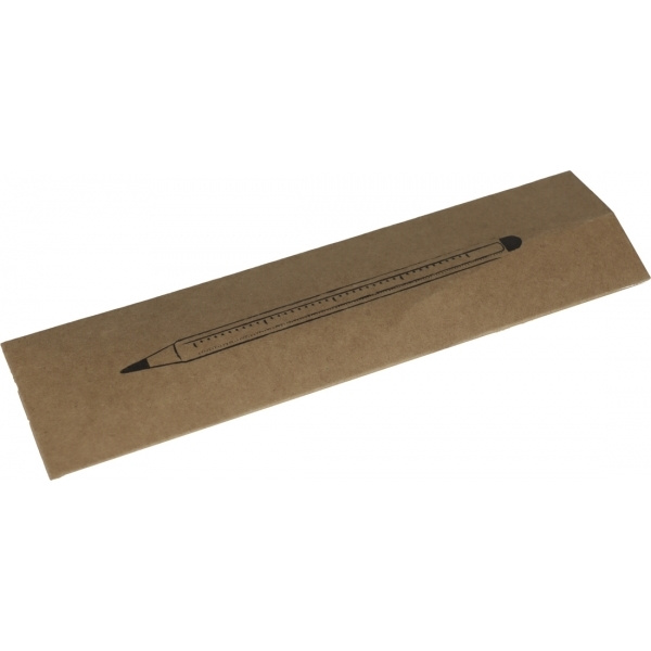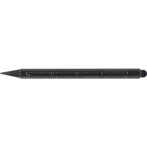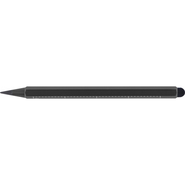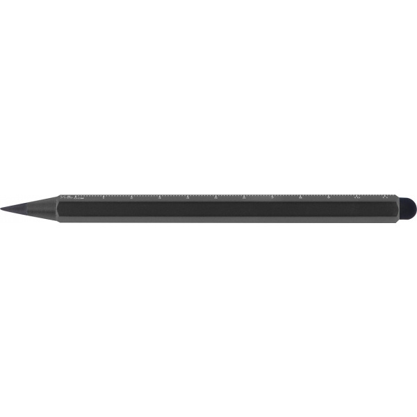 Alumiiniumist tindita pliiats puutefunktsiooni ja skaalaga cm ja tollides. Plii on valmistatud grafiidi ja metalli segust, mis muudab selle äärmiselt vastupidavaks. Teie logo graveeritakse tünni vabale kohale.