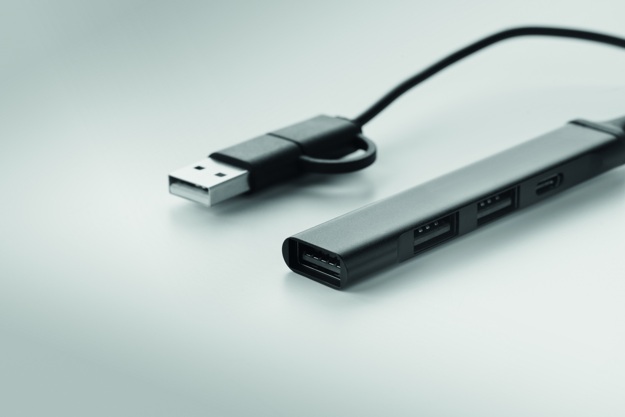 4 pordiga taaskasutatud alumiiniumist USB-jaotur. 3 USB-A + 1 tüüpi C. Sisend: 2-in-1 Type-C & Type-A. Kaabli pikkus: 19 cm.