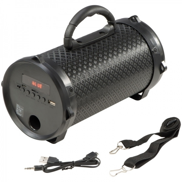 Bluetooth-kaiutin, jossa on monia ominaisuuksia: FM-radio, AUX-portti, MP3-toisto Micro SD-kortilla tai USB-liitännällä, sisältää USB-latauskaapelin 3,5 mm:n pistokkeella sekä irrotettavan kantohihnan ja 2 tunnin akunkeston. Logosi painetaan koteloon.
