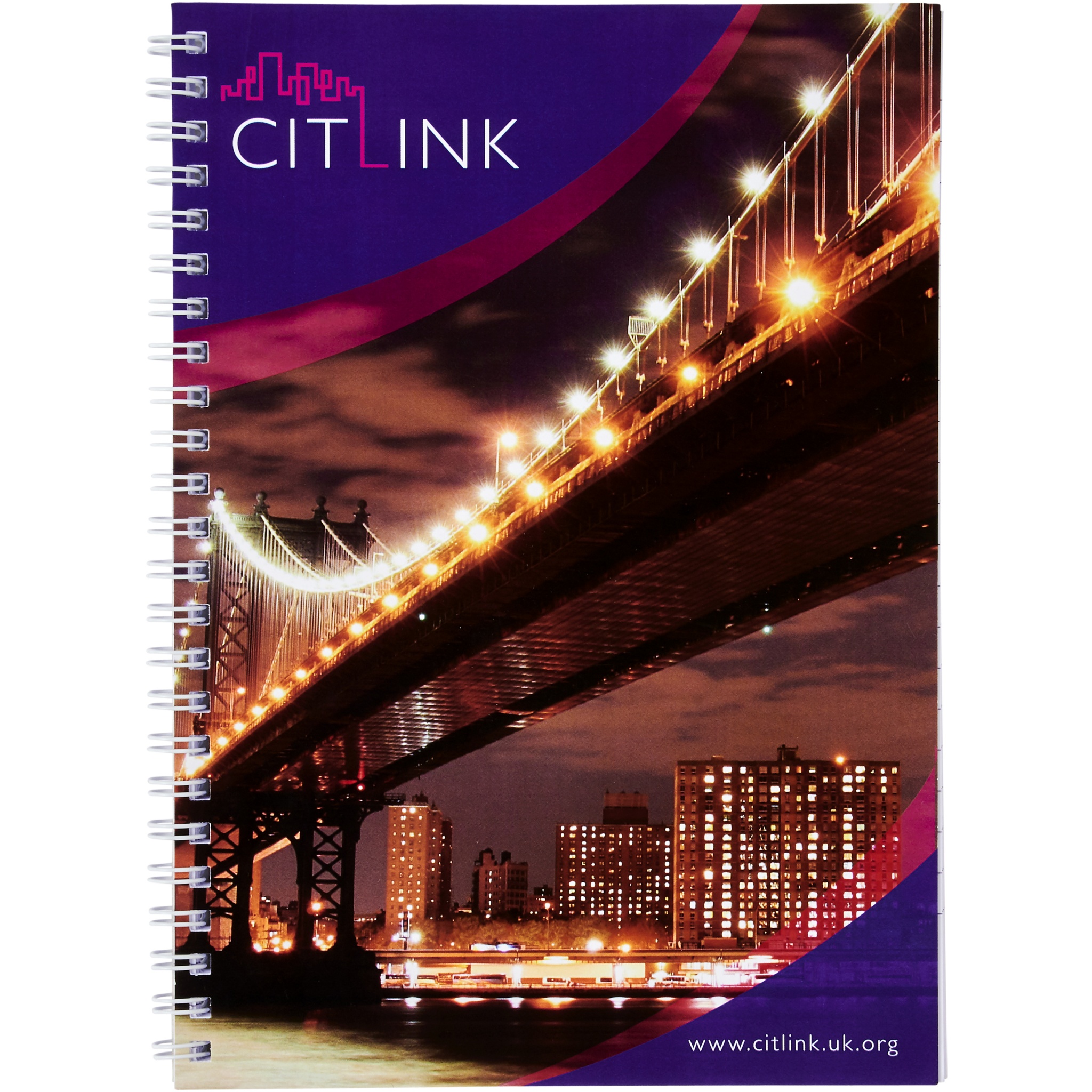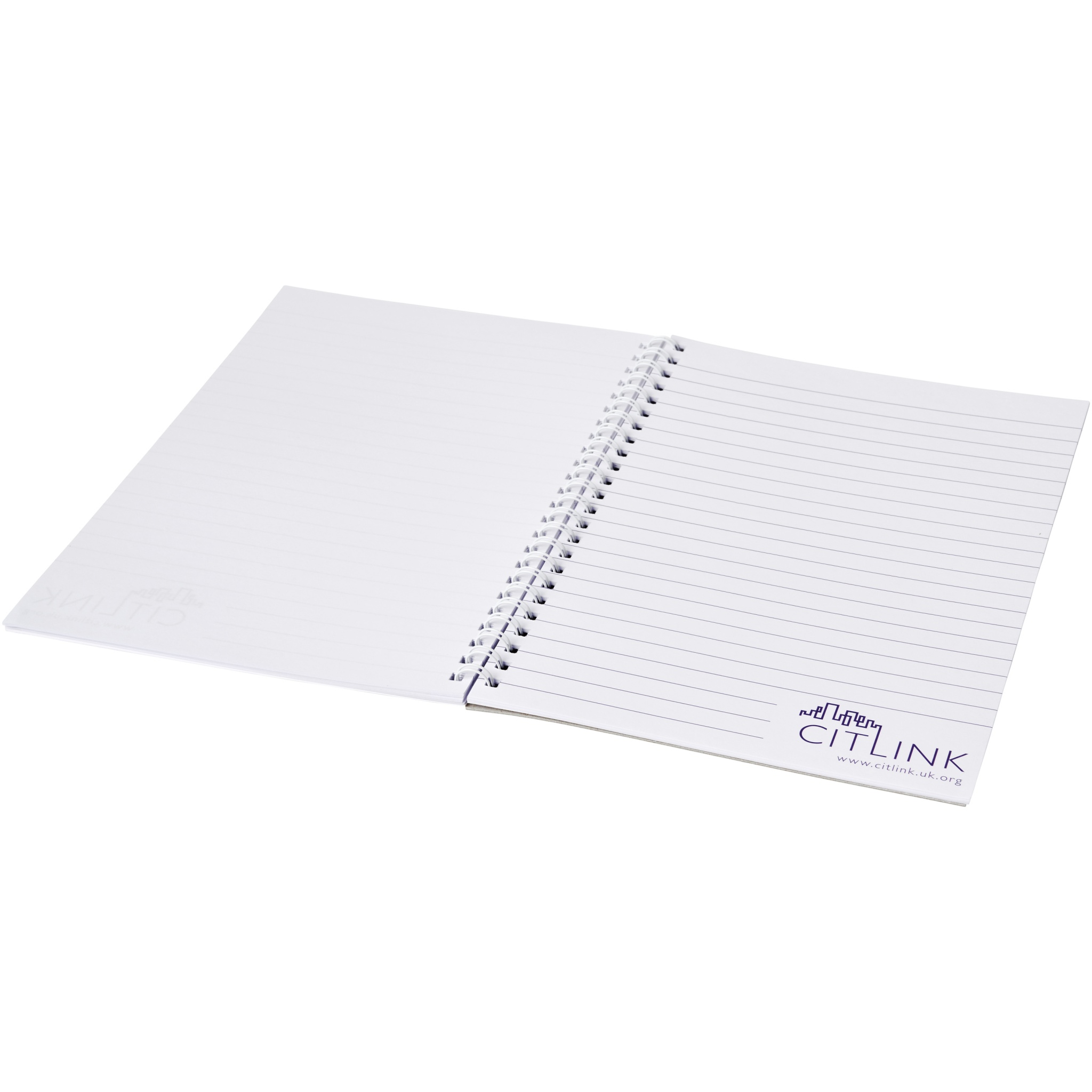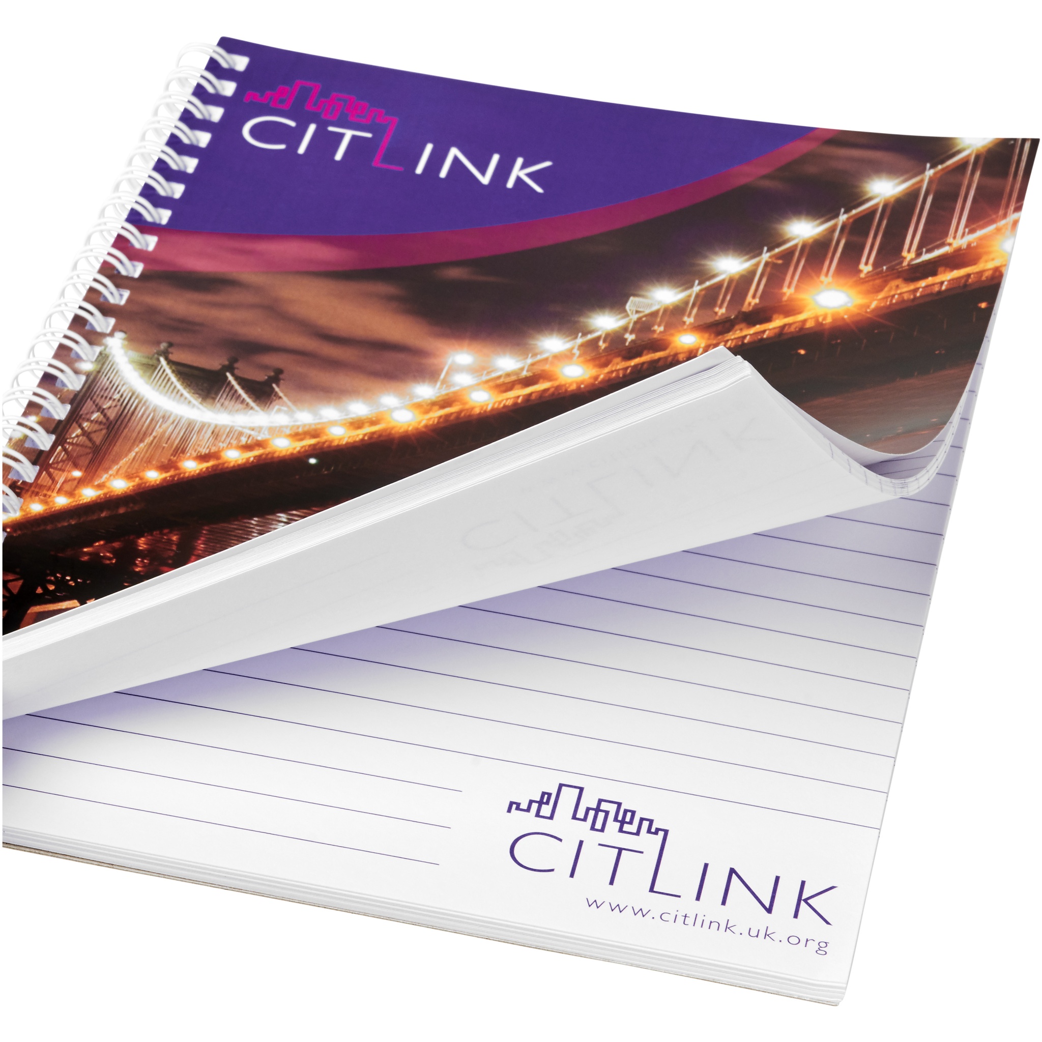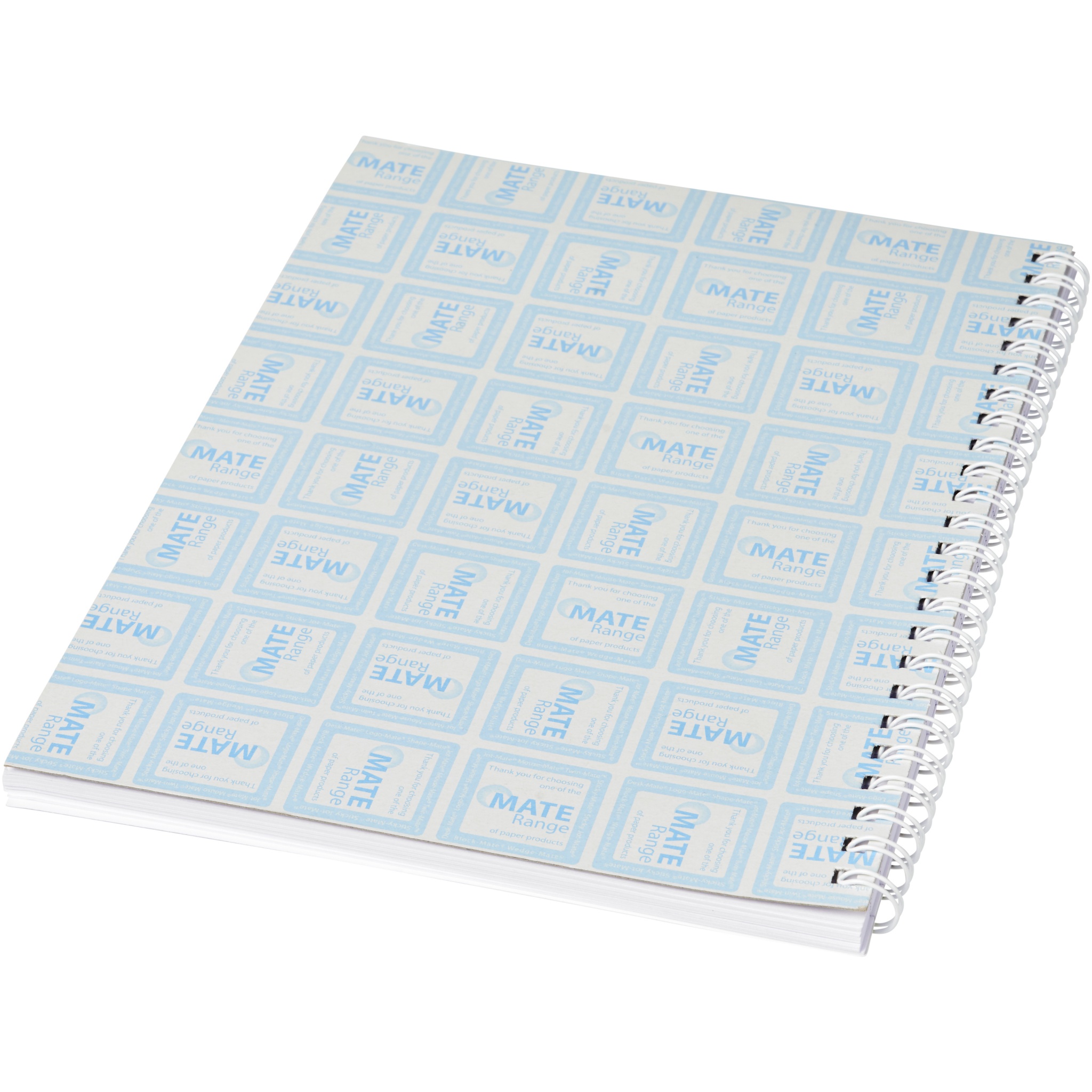 Desk-Mate®-spiraalimuistikirja, A4. Tässä muistikirjassa on valkoinen tai musta kierre. Kiiltävä kartonkikansi edessä (250 g/m2) ja (80 g/m2) tyhjää paperia. Toimitetaan tavallisesti 50-arkkisena. Myös 80 arkkia saatavilla. Voit räätälöidä muistikirjan täysin. Valitse esimerkiksi viivoitetut, ruudulliset tai blankot sivut - kaikki on mahdollista!
