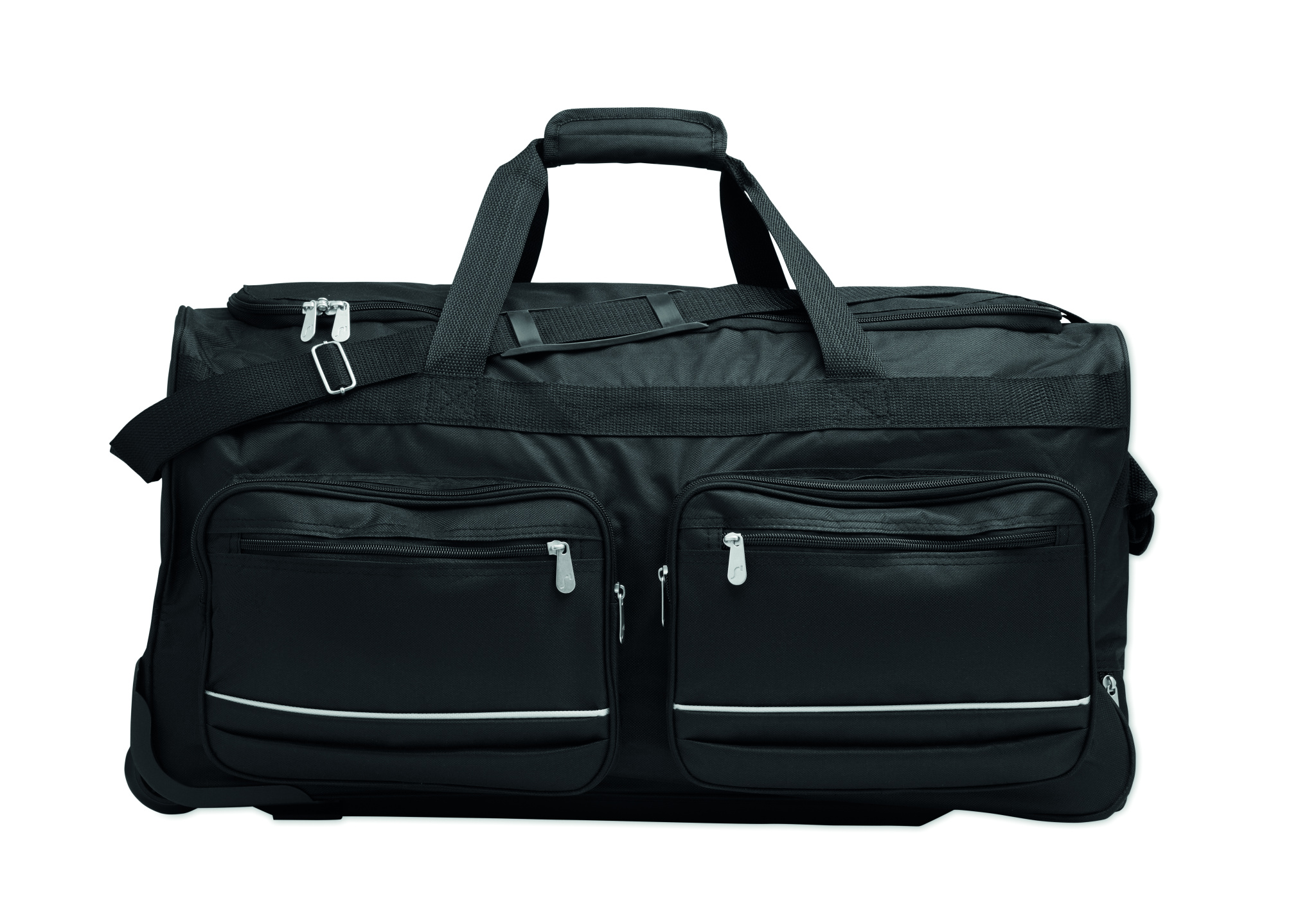 Pehmeä duffeli vetolaukku 600D RPET -materiaalia. Vetoketjullinen etutasku. Kaksi sivutaskua. Kolme sisätaskua. Pehmustetut olkahihnat. Kaksi pyörää ja tuplaputkirunko.