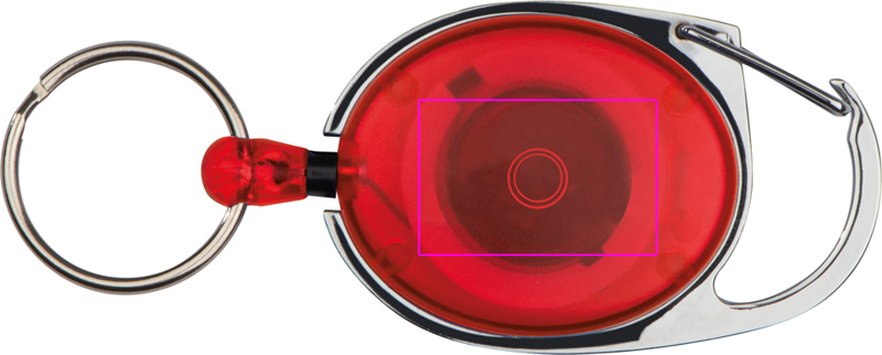 Avaimenperä, jossa on pieni neppari, vyöpidike ja ulos vedettävä avaimenperä. Logosi painetaan värilliselle muovialueelle.