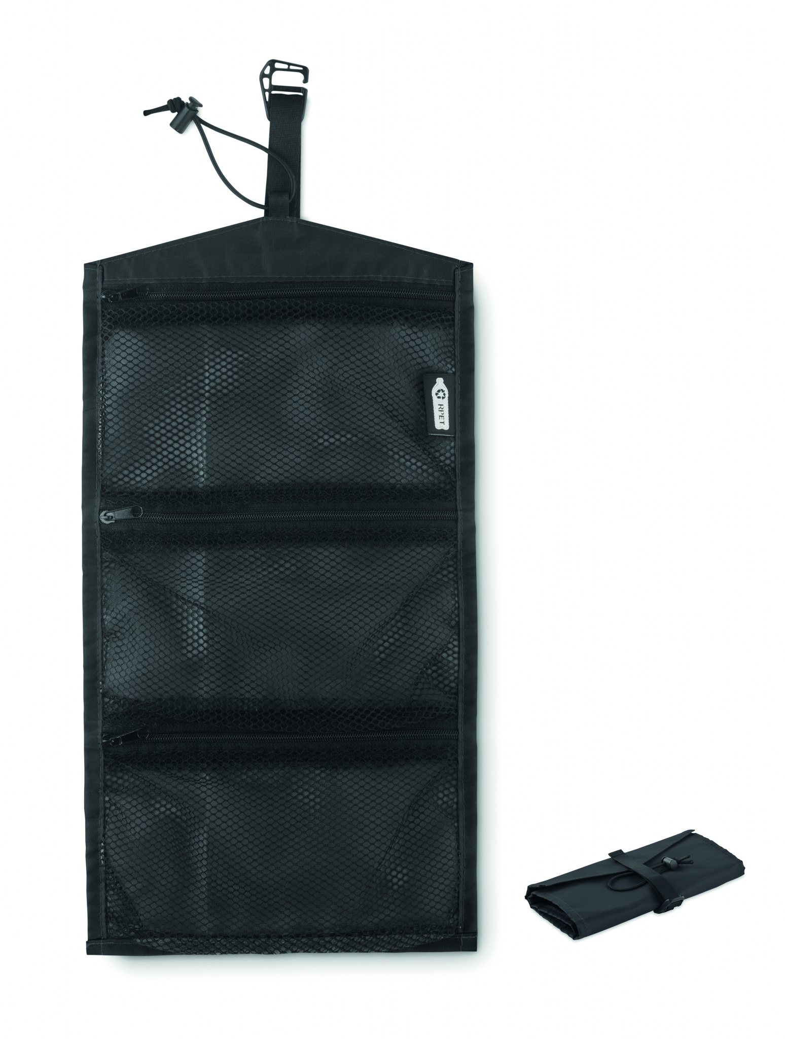 210D RPET:stä valmistettu rullattava laukku kaapeleiden ja johtojen säilytykseen. 3 vetoketjulokeroa REPT-verkolla. Sopii myös kosmetiikkalaukuksi.