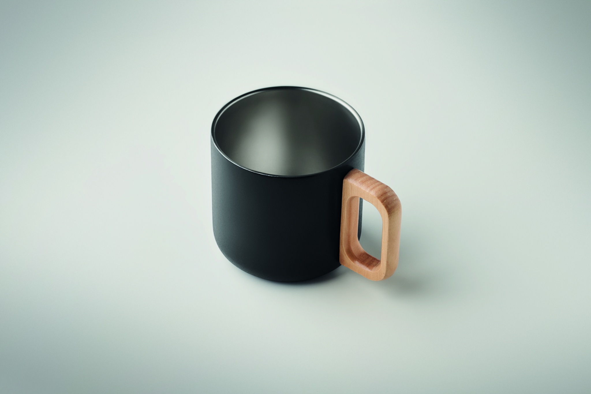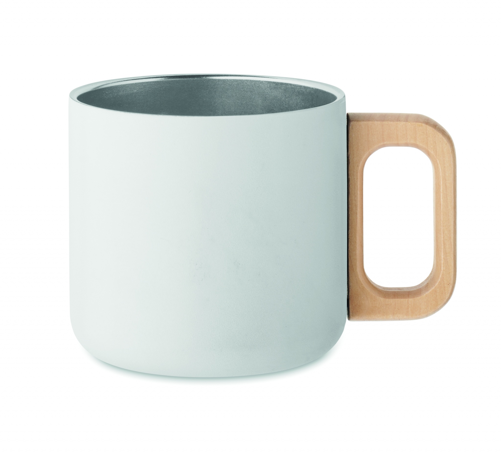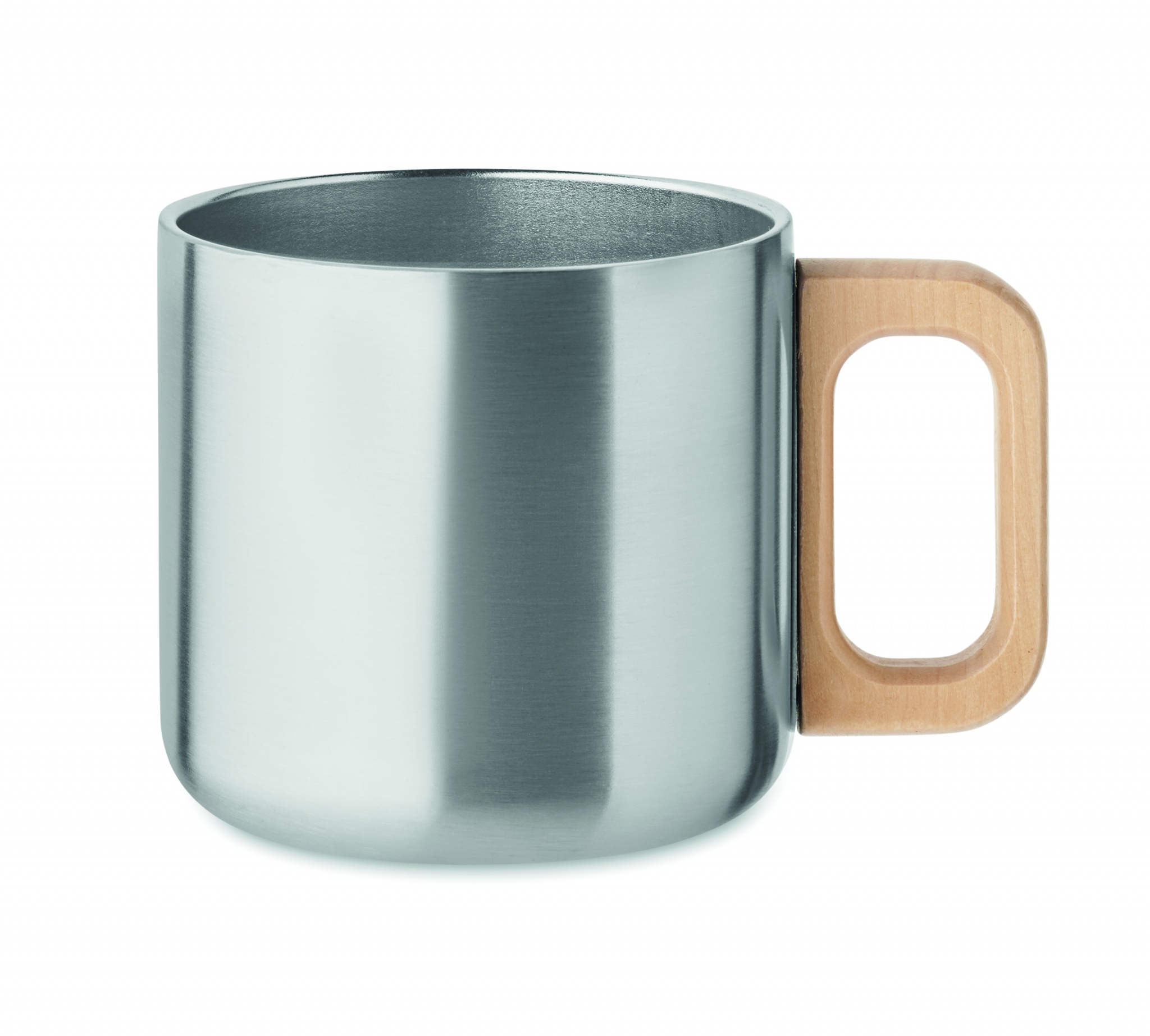 Kaksiseinäinen muki kierrätetystä ruostumattomasta teräksestä (90 % kierrätettyä ruostumatonta terästä ja 10 % ruostumatonta terästä) muki puukahvalla. Tilavuus: 350 ml.