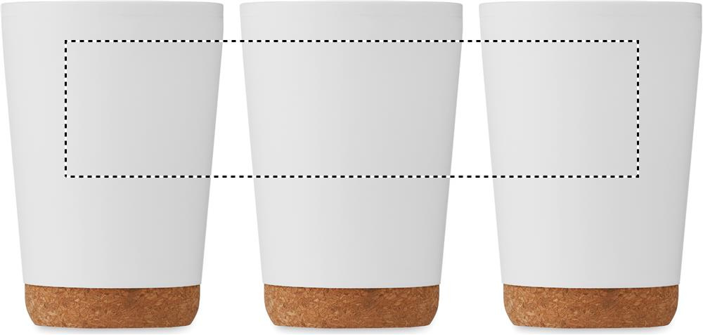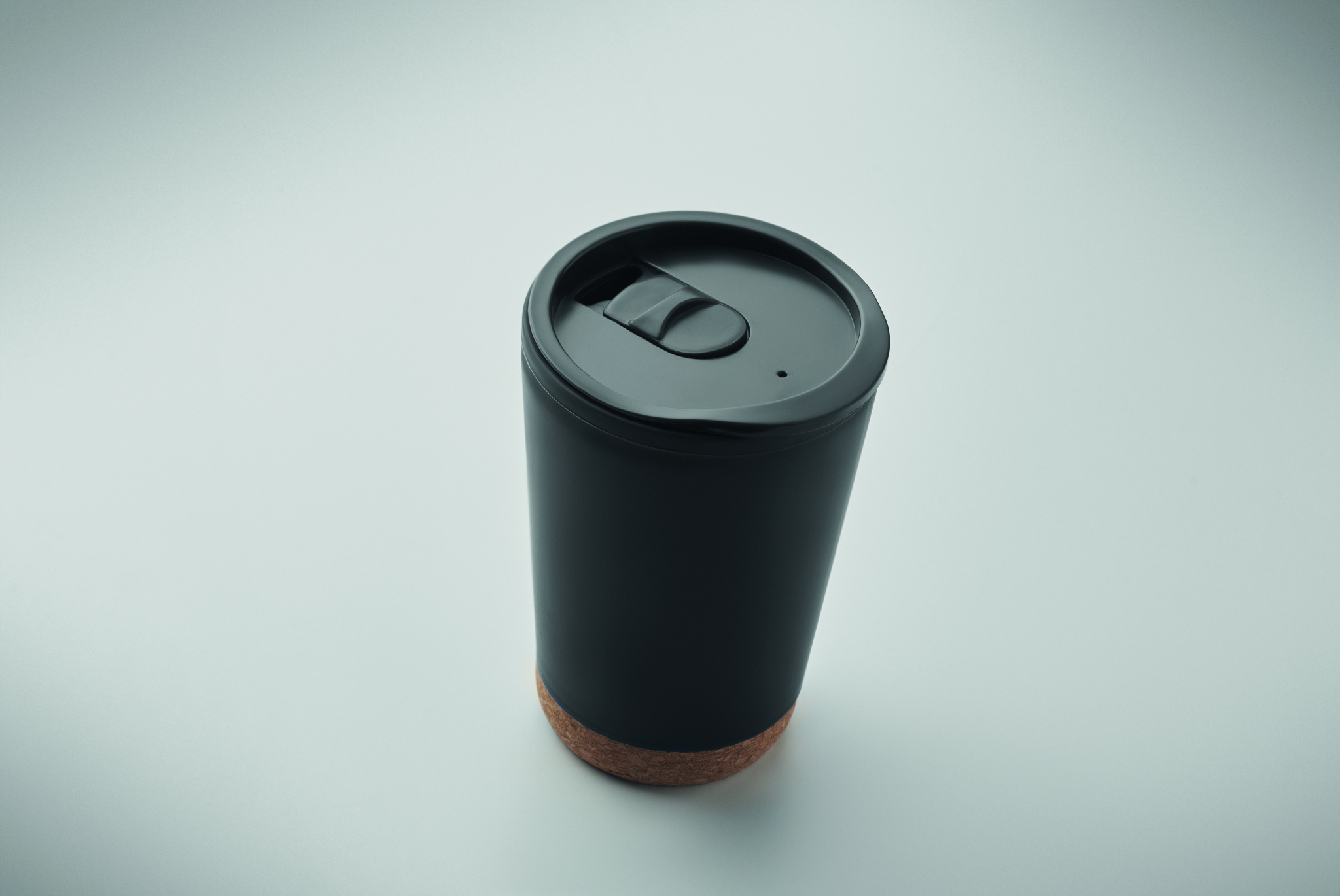 Kaksiseinäinen juomalasi PP-materiaalia, korkkipohja ja liukusuljettava juomasuukappaleen kansi PS- ja ABS-materiaalia. Tilavuus: 300 ml.