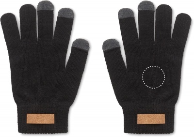 Älypuhelimen kosketusnäyttökäsineet RPET-polyesteriä. Käsineissä on korkkia oleva merkki merkkausta varten.
