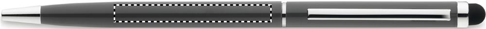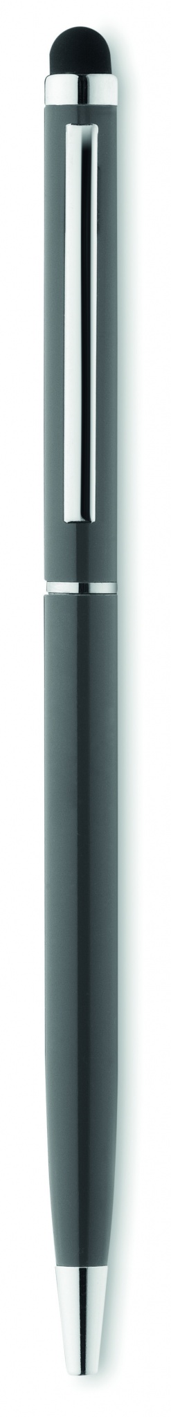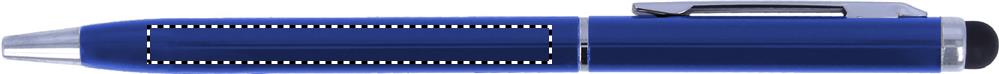 Twist action alumiininen kuulakärkikynä sinisellä musteella, kosketusnäyttöpäällä ja kiiltävillä kromi yksityiskohdilla.