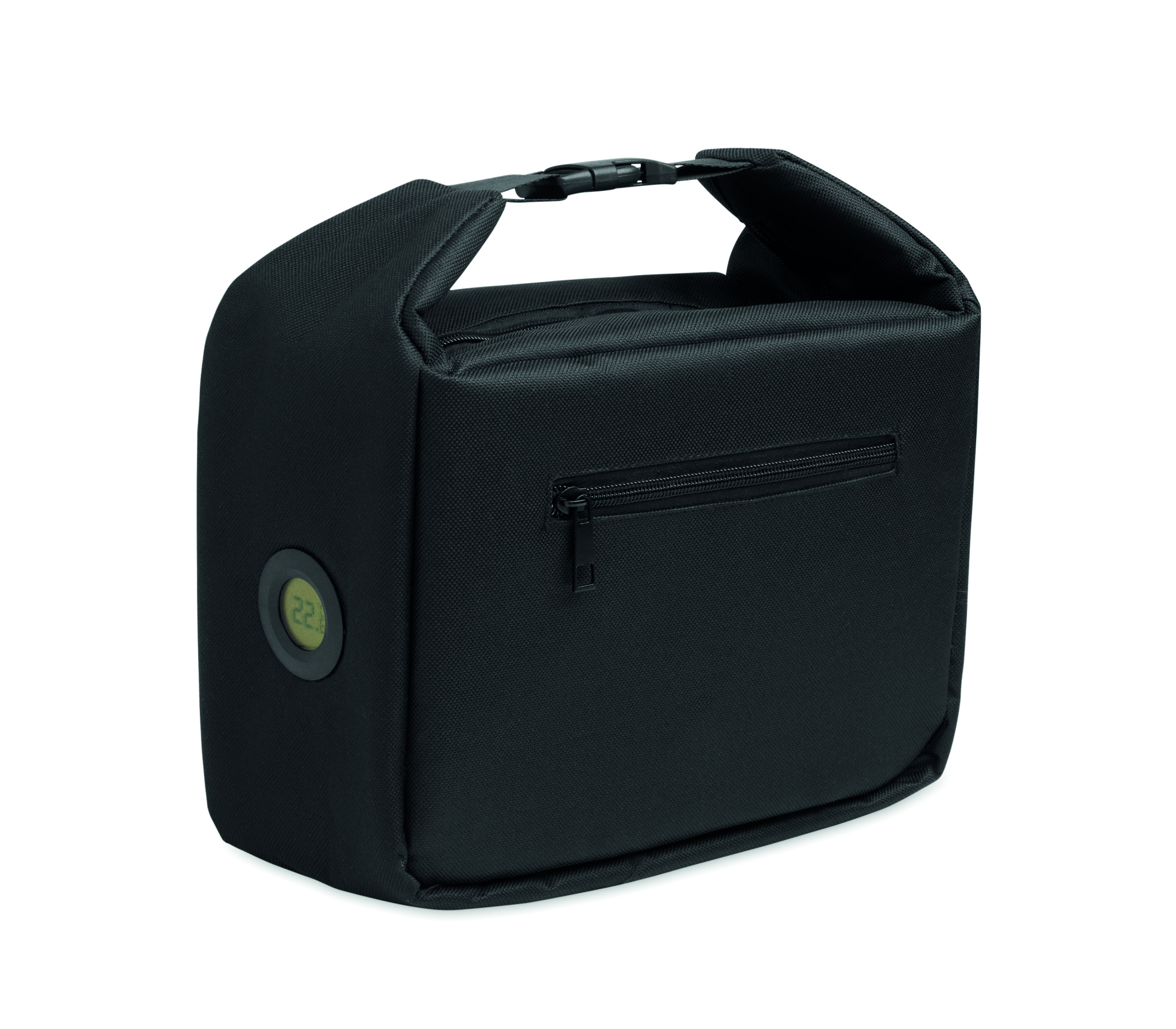 Kylmälaukku lounaalle lämpötilanäytöllä, valmistettu 600D RPETistä, 3 mm PE-vaahdolla ja alumiinifoliovuorilla. Solkilukko, vetoketjullinen päälokero ja sivutasku. Tilavuus 10 L.