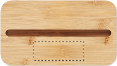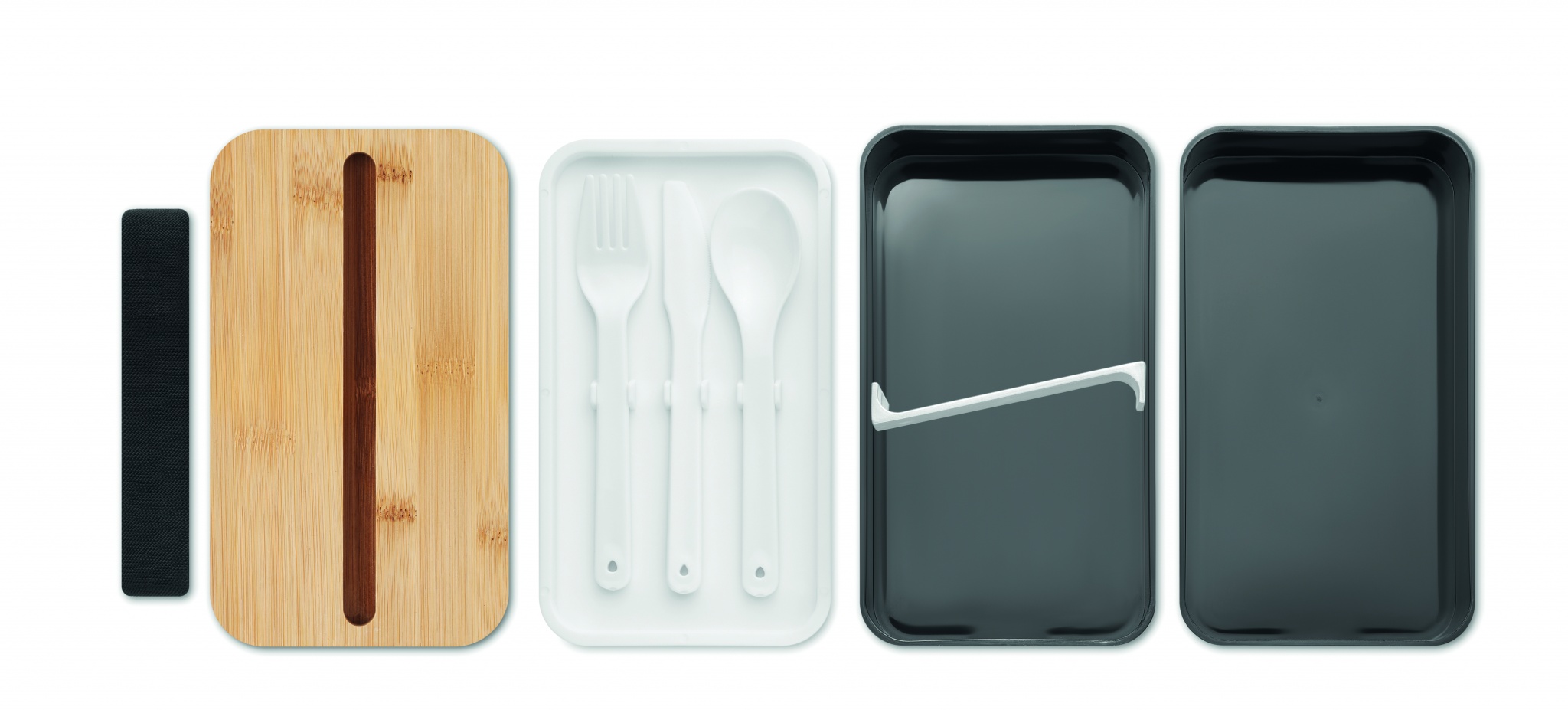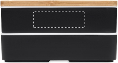 Kierrätetystä PP:stä valmistettu kaksikerroksinen lounaslaatikko, jossa on irrotettava väliseinä ja 3 ruokailuvälinettä, kiinnitettävä polyesterinauha ja bambukansi. Kannessa on puhelinteline. Tilavuus: 400 ml (2x).