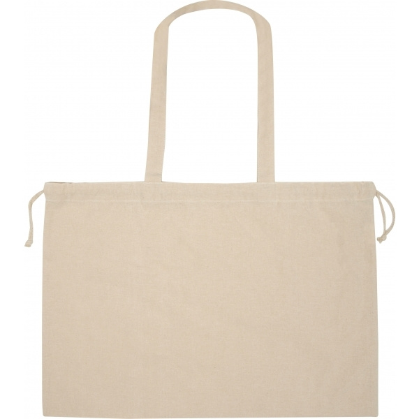 Öko-Tex® STANDARD 100 -sertifioitu luomupuuvillapussi, jonka neliömassa on 180 g/m², kaksi pitkää kahvaa ja kiristysnyörillä suljettava. Painamme logosi pussin keskelle toiselle puolelle.