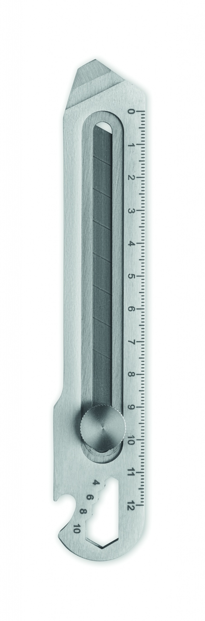 Ruostumattomasta teräksestä valmistettu mattoveitsi, jossa 8 hiiliteräksistä terää, pullonavaaja, jakoavain ja viivotin.
