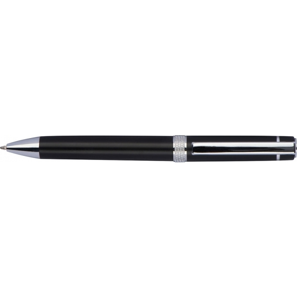 Alumiinista valmistettu Twist-toimintakuulakynä, jossa on sininen kirjoitusjärjestelmän täyttö. Kromattu sovellukset ja kimalteleva koristerengas antavat kynälle sen erityisen ilmeen. Logosi on kaiverrettu klipsien oikealle puolelle.