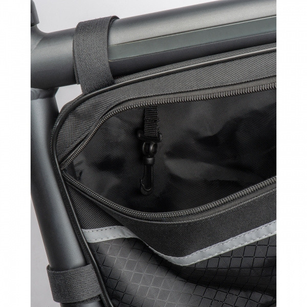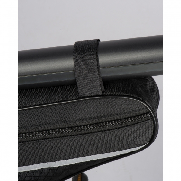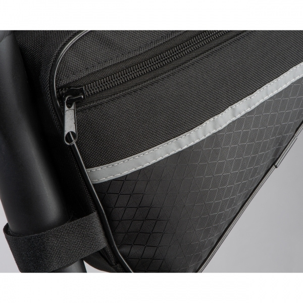 Kestävästä 600D polyesterista valmistettu pyörälaukku heijastavilla raidoilla. Laukku voidaan kiinnittää helposti keskimmäiseen runkoon kiinnikkeiden avulla ja siinä on riittävästi tilaa kaikille tärkeille välineille. Painamme logosi pussiin.