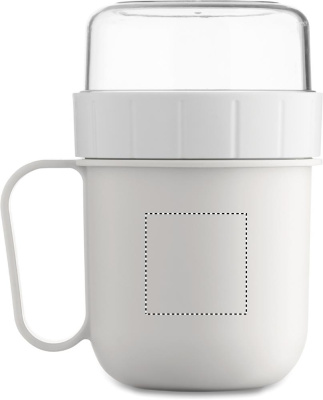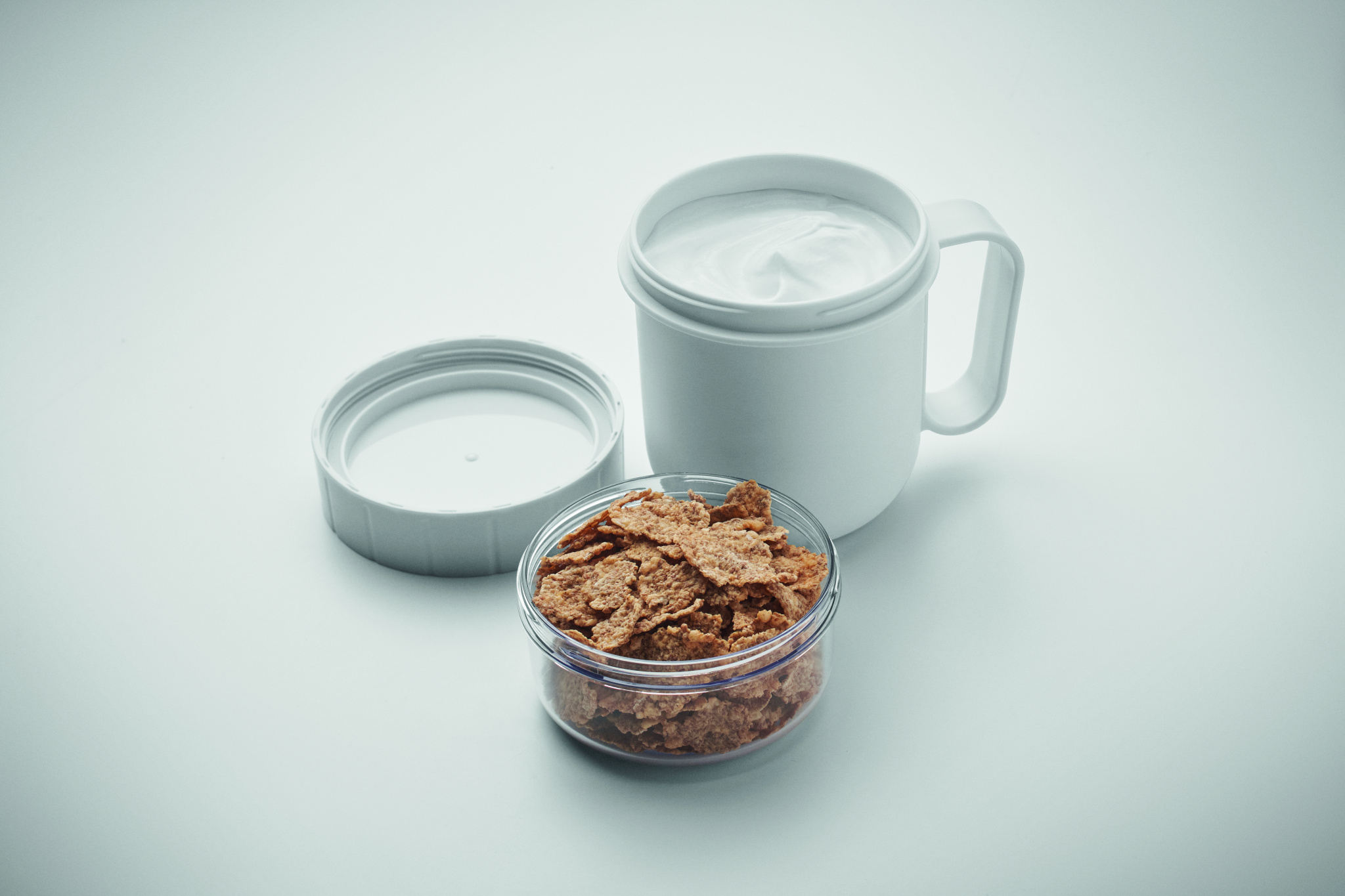 Aamiaista tai brunssia mukaan otettavaksi tarkoitettu kuppi PP- ja PS-korkissa. Sisältää kaksi erillistä rasiaa, jotka pitävät ainekset erillään. Tilavuus: 450 ml ja 160 ml. Vuotamaton.
