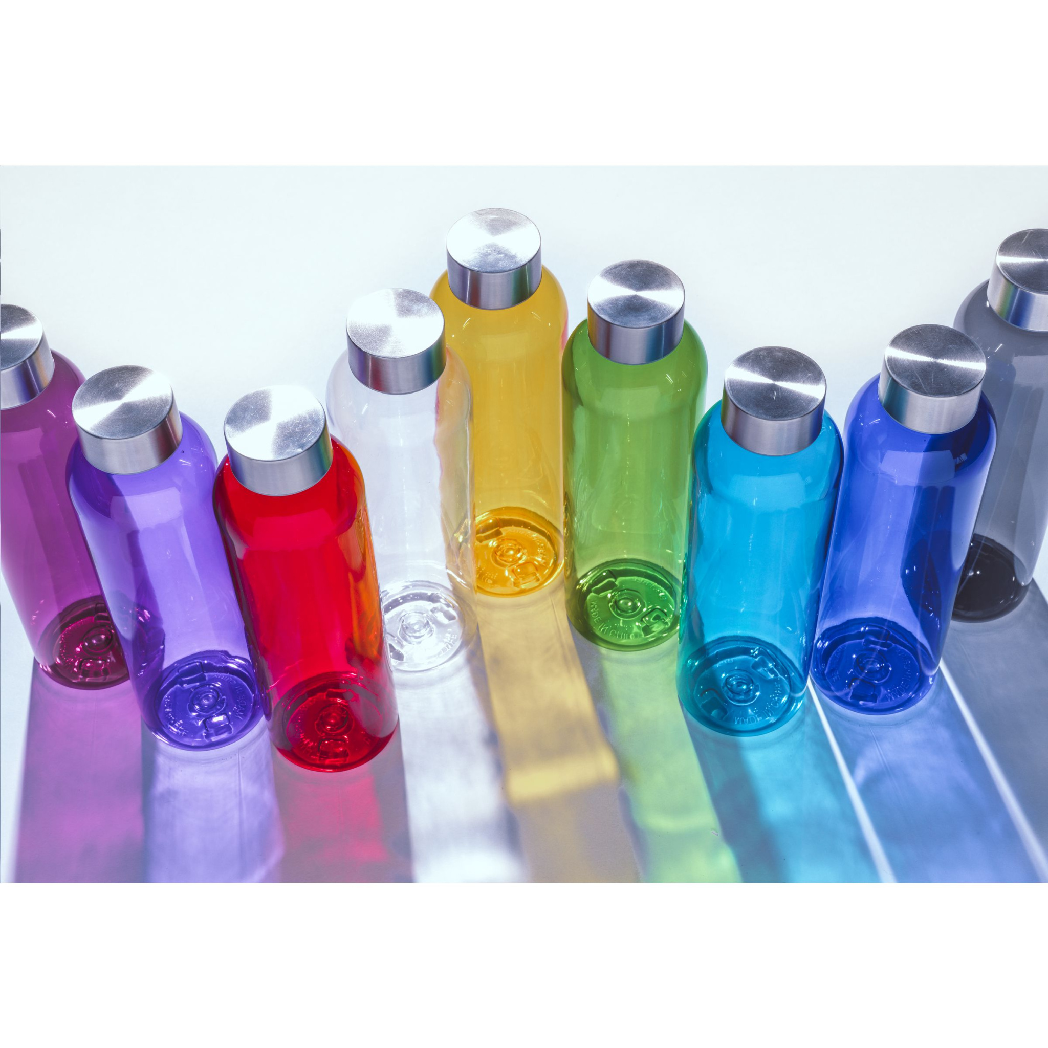 Läpinäkyvä, BPA-vapaa vesipullo, valmistettu PCTG SK -muovista. Ruostumattomasta teräksestä valmistettu kierrekansi. Tyylikäs muotoilu kiinnittää huomion välittömästi ja on erittäin mukava. Vuotamaton. Tilavuus 650 ml.