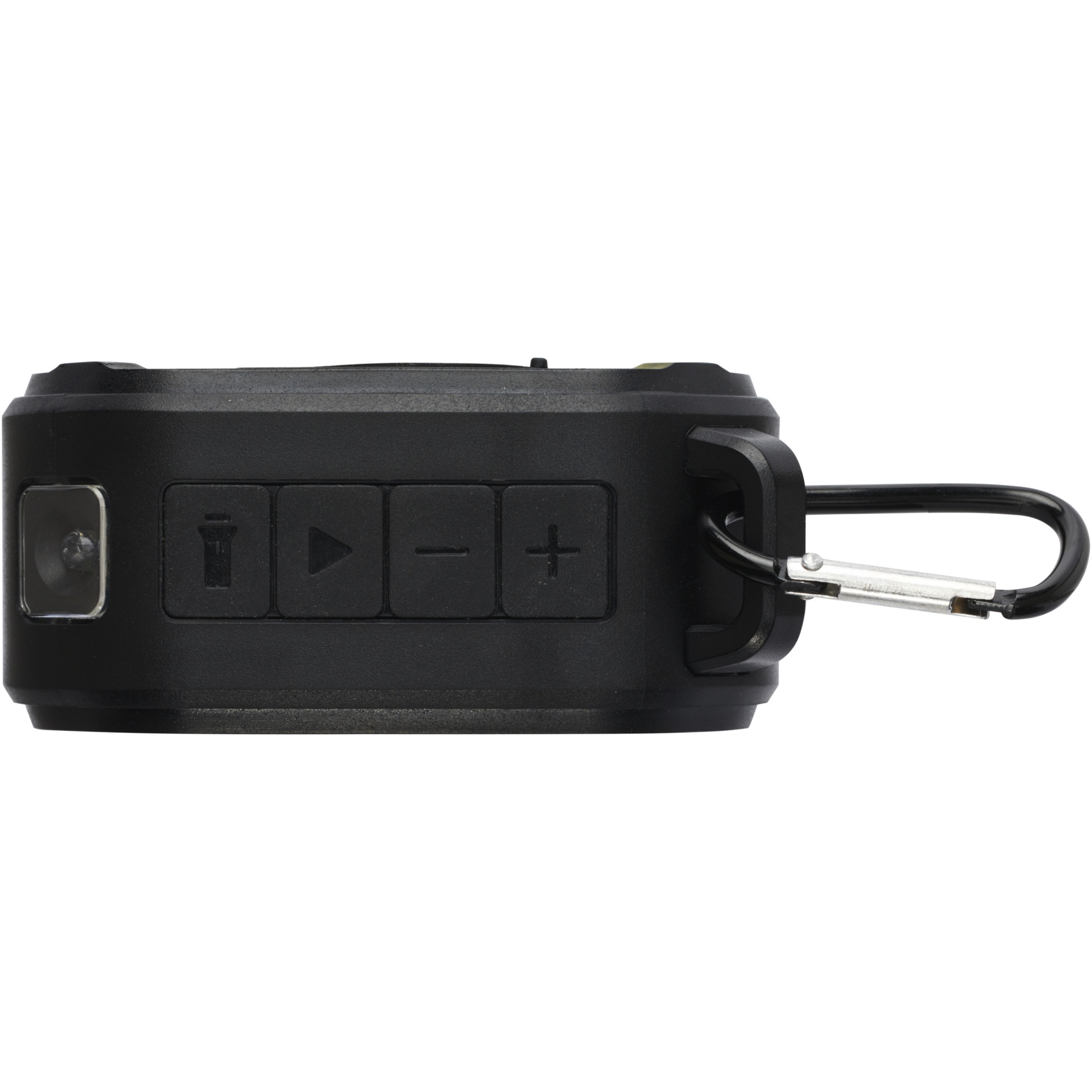 Tehosta musiikkiasi tällä RCS-kierrätetyllä, kestävällä ja aurinkoenergialla toimivalla taskulampullisella 3 W:n Bluetooth®-kaiuttimella! Se toistaa musiikkia, podcasteja jne. mistä tahansa Bluetooth®-yhteensopivasta laitteesta, minkä ansiosta se sopii hyvin mukaan matkalle. Kaiuttimessa on sisäänrakennetut musiikin säätimet ja mikrofoni puheluita varten liikkeellä ollessasi sekä kätevä taskulamppu. Mukana tulevan jousihaan avulla se voidaan helposti kiinnittää esimerkiksi reppuun, ja IPX5-sertifioinnin ansiosta kaiutin on suojattu rankalta sateelta. 400 mAh:n Li-ion-akun ansiosta voit kuunnella musiikkia jopa 3-4 tunnin ajan suurimmalla äänenvoimakkuudella. Latausaika on 2 tuntia kaapelilla ja noin 6 tuntia aurinkopaneelilla (riippuen auringonvalon kirkkaudesta/yhtäjaksoisuudesta). Taskulampun toiminta-aika on 10 tuntia, kun kaiutintoiminto on pois päältä. Bluetooth® 5.3, jonka toimintasäde on noin 10 metriä. Mukana toimitetaan käyttöohje ja 30 cm:n USB-A to Type-C -latauskaapeli. Pakattu 100-prosenttisesti kierrätettyyn voimapaperilaatikkoon.