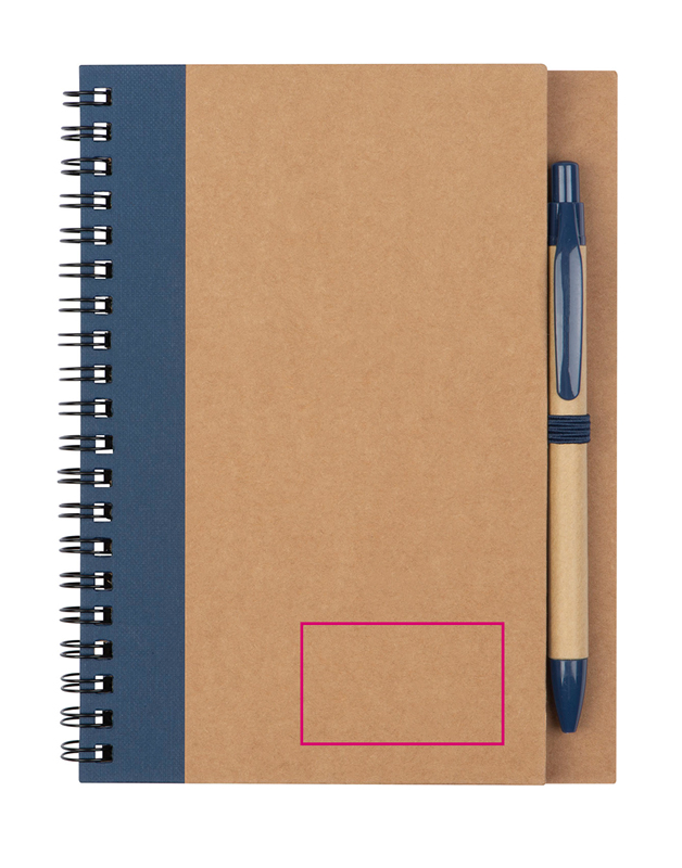 Kierresidottu vihko, jossa on 120 kierrätyspaperista valmistettua tyhjää sivua (kansi 250 gsm, sivut 60 gsm) ja kynälenkki. Mukana tulee kierrätyspaperista valmistettu kuulakärkikynä, jossa on ei-vaihdettava sinikirjoitustäyttö ja ABS-muovikoroste.