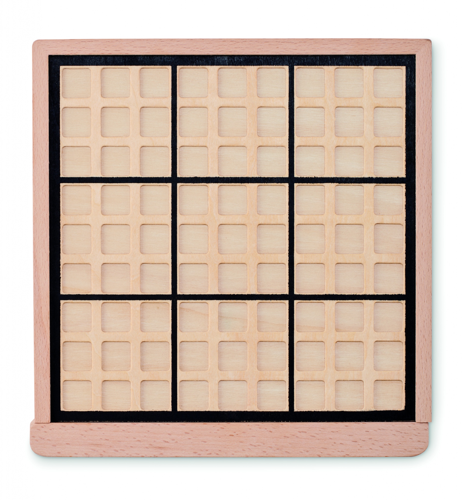 Puusta tehty sudokutaulu. Sisältää 99 numeroitua puulaattaa. Mukana peliopas, jossa ohjeet, arvoitukset ja ratkaisut.