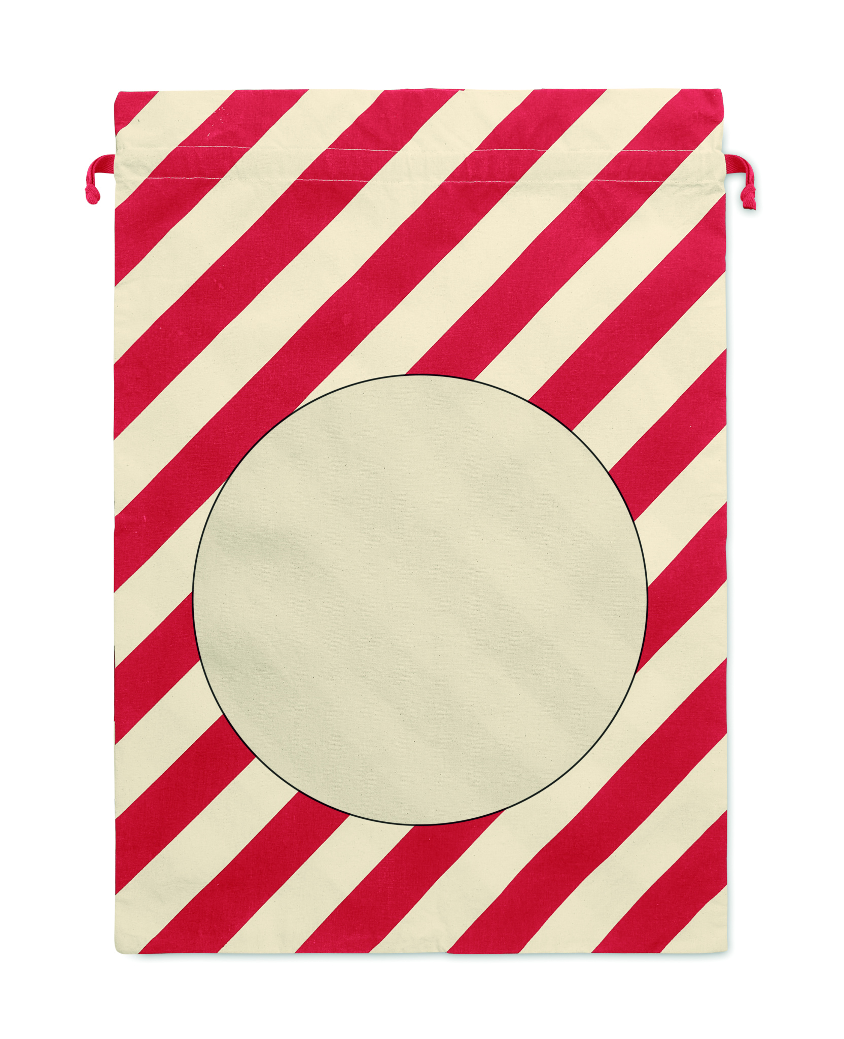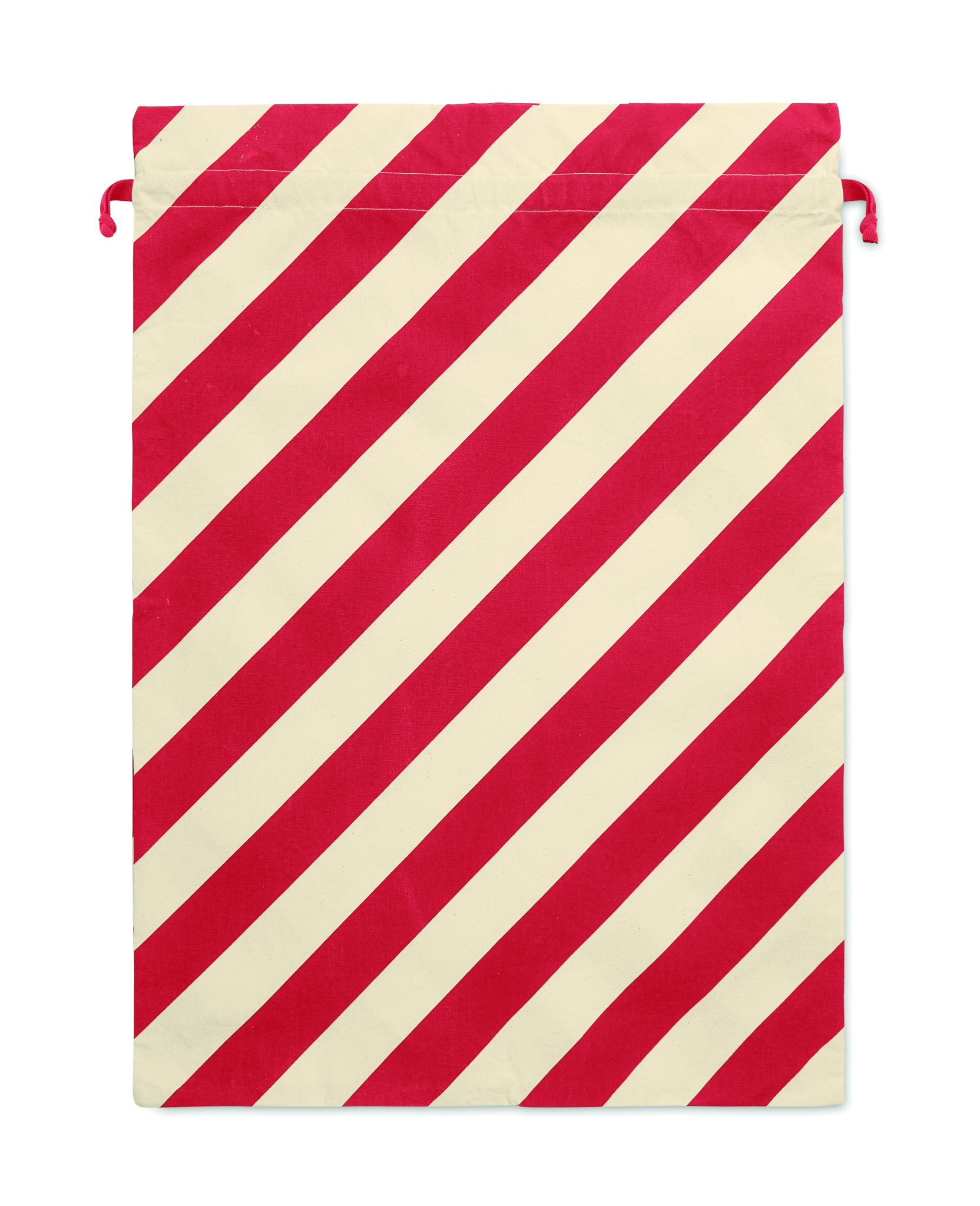 Suuri puuvillainen kiristysnyörillä varustettu jouluinen kassi. Koko noin 50x70 cm. 180 g/m².