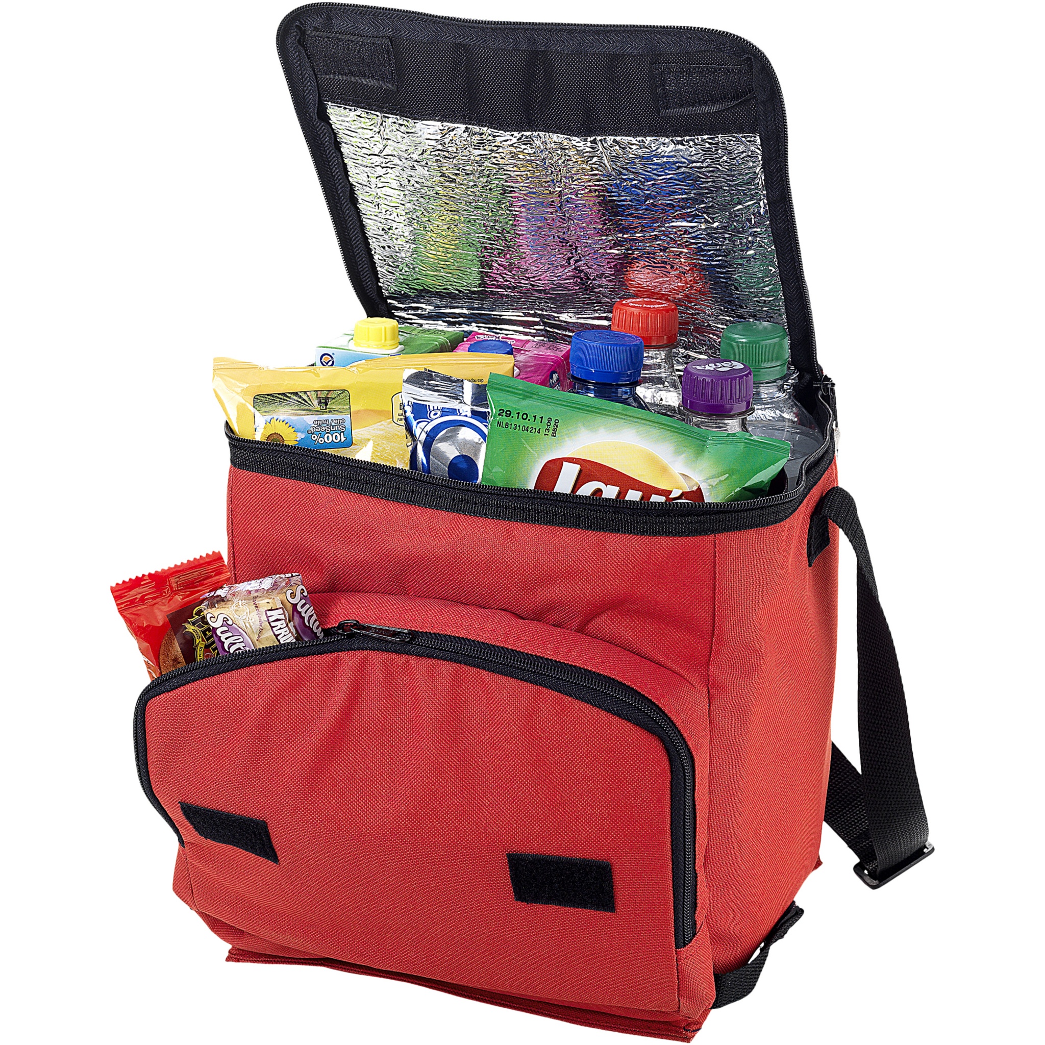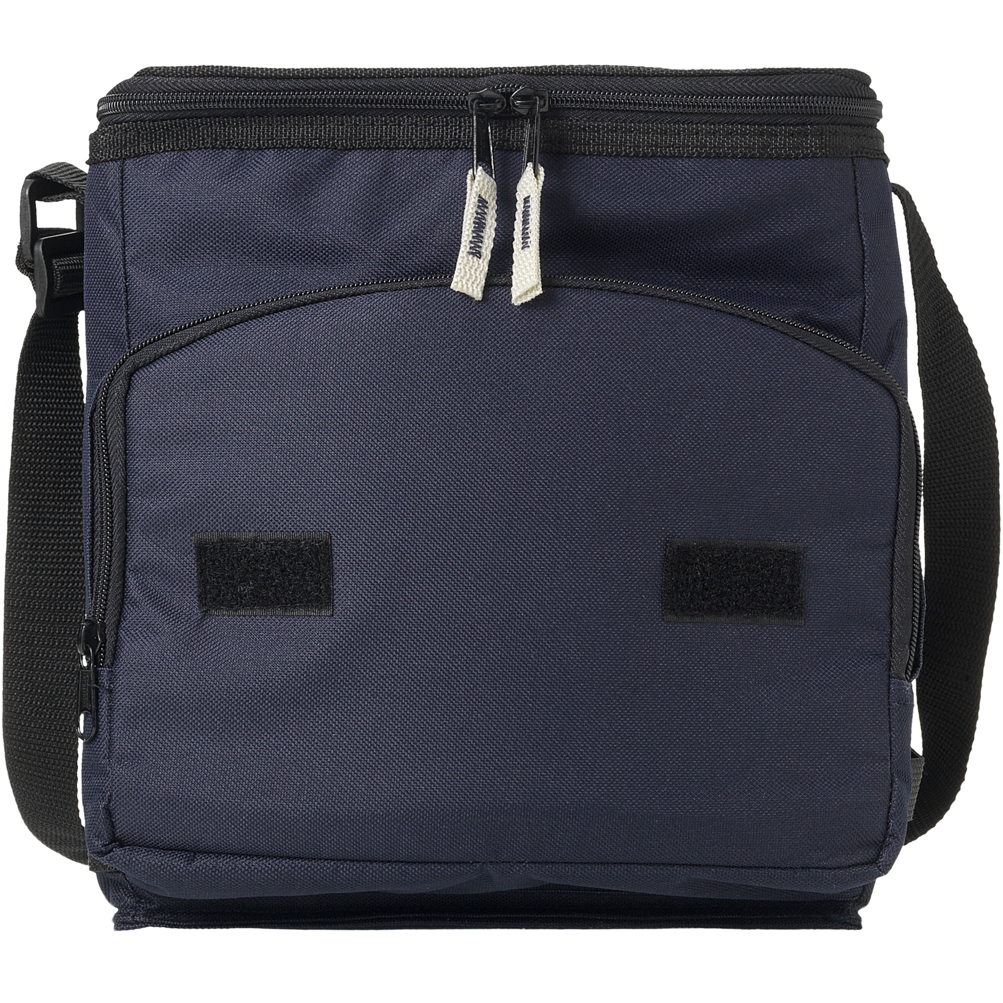 Taitettava kylmälaukku, jossa on vetoketjullinen etutasku. Säädettävä olkahihna. Kymälaukun saa litteäksi etutaskun velcro-tarranauhan avulla. Tarvikkeet rekvisiittaa.