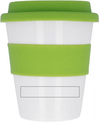 Yksiseinäinen 350 ml PP muki silikonikannella ja -vyötteellä, tuote saattaa kuumentua ulkoisesti käytössä.