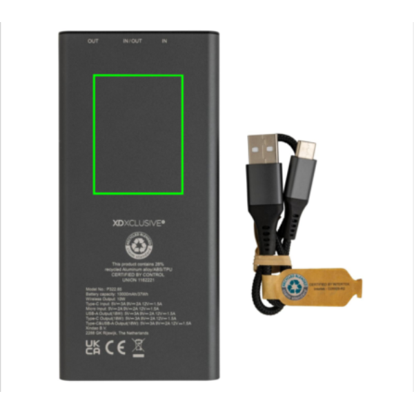 Ultranopea varavirtalähde, joka on valmistettu RCS (Recycled Claim Standard) -sertifioidusta kierrätetystä alumiinista ja ABS:stä. Kierrätetyn materiaalin kokonaismäärä: 28% tuotteen kokonaispainosta. Alumiini ei menetä ominaisuuksiaan kierrätysprosessissa, ja sitä voidaan kierrättää loputtomasti. Sisältää pitkäkestoisen A-luokan 10000 mAh litiumpolymeeriakun. C-lähtöportti tukee jopa 18W nopeaa latausta ja nopeaa uudelleenlatausta 3 tunnissa. Langaton laturi tukee latausta 10W asti. Virran merkkivalot kertovat, milloin on aika ladata tuote uudelleen. Tuote ja lisätarvikkeet 100% PVC-vapaita. Sisältää tyypin C latauskaapelin valmistettuna RCS-sertifioidusta kierrätetystä alumiinista, TPE:stä ja PET-materiaalista. Pakattu FSC® sekoituksesta valmistettuun pakkaukseen. USB lähtövirta 5/3A, 9V/2A. 12V/1.5A. Tyypin C lähtövirta: 5V/3A, 9V/2A, 12V/1.5A. Tyypin C tulovirta: 5V/3A, 9V/2A, 12V/1.5A. Mikro USB tulovirta: 5V/2A, 9V/2A, 12V/1.5A.