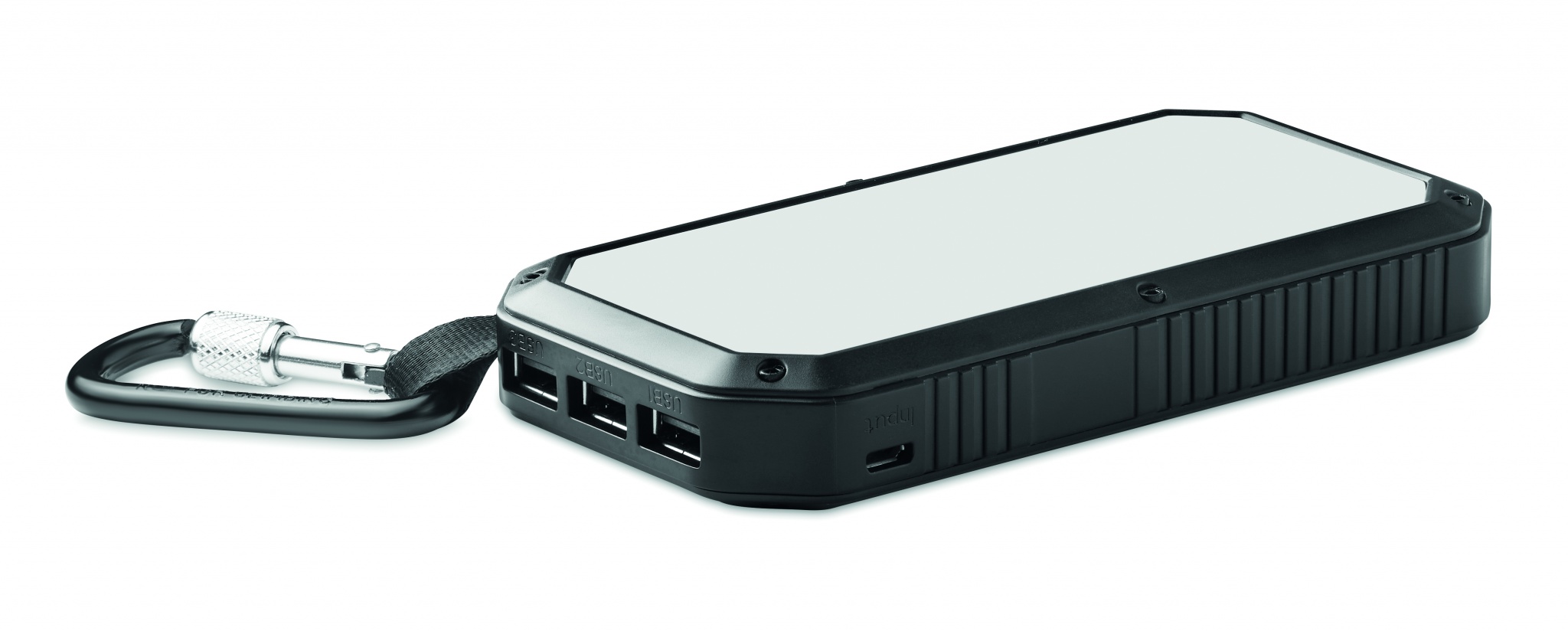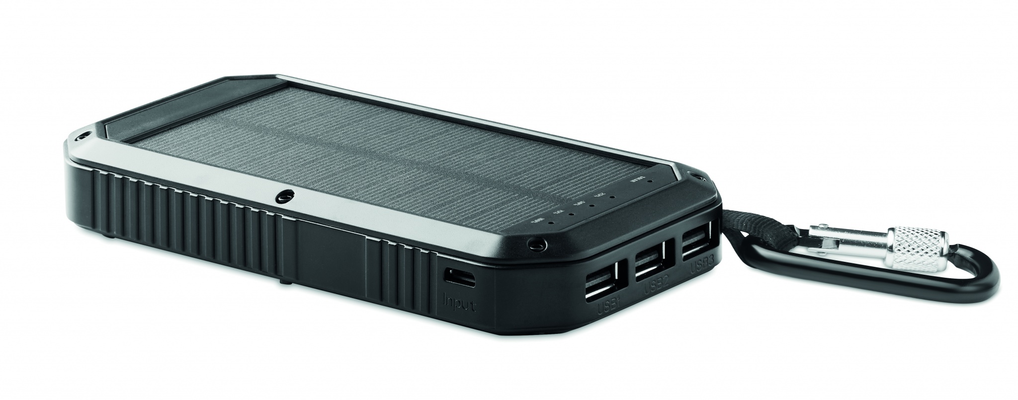 Aurinkokennolla toimiva varavirtalähde 8000 mAh akulla ja taskulamppu toiminnolla.