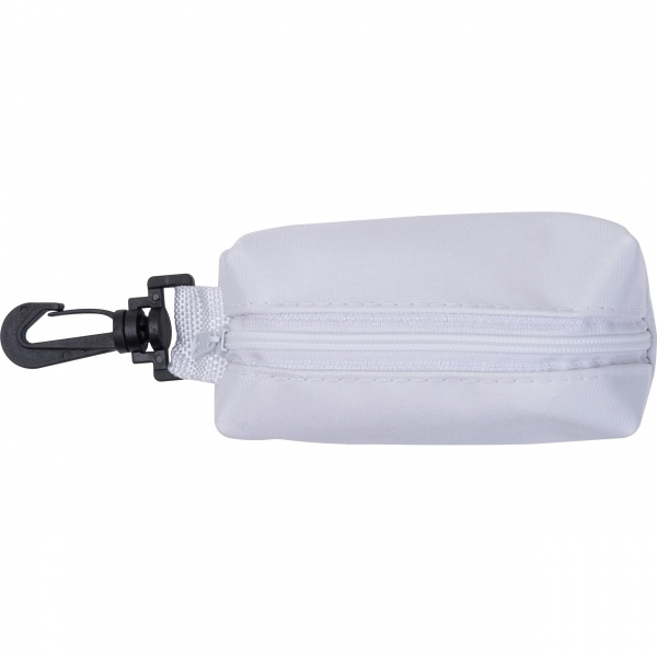 Polyesteristä valmistettu pussukka, jossa on vetoketju, muovinen karbiinihaka ja kahdeksan eriväristä lyijykynää. Logosi on painettu pussukkaan.