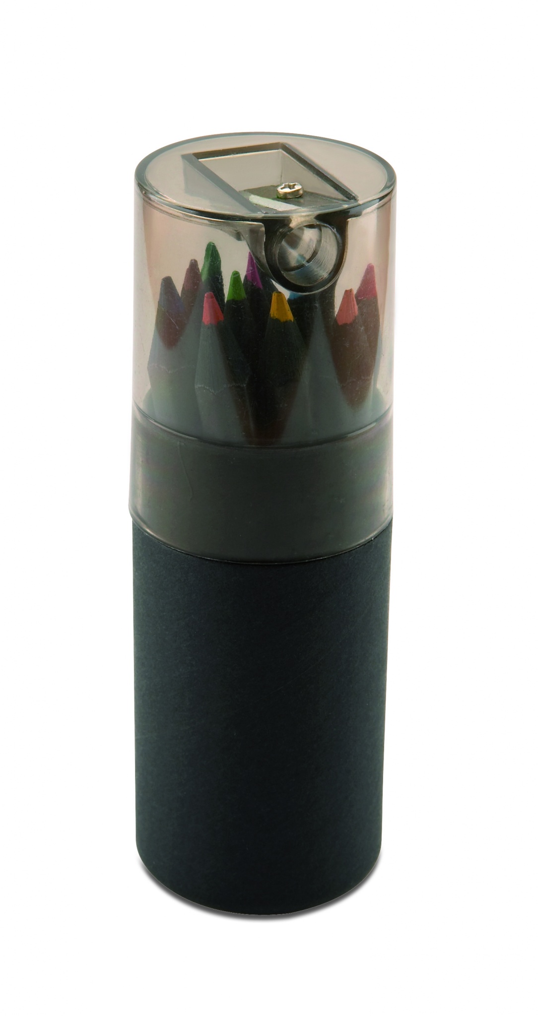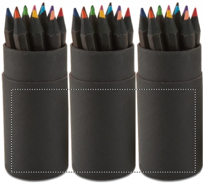 Musta kartonkipakkaus sisältää 12 värikynää ja kynien teroittimen pakkauksen kannessa.