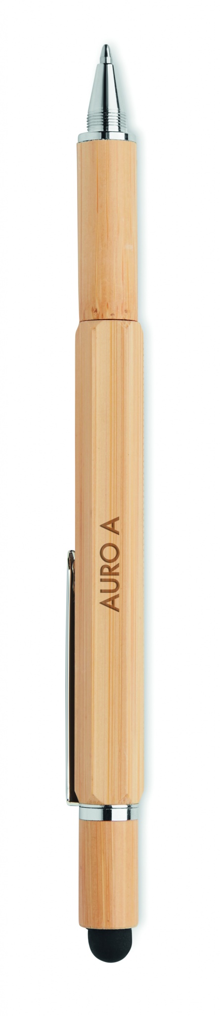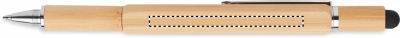 Kierrätetty vesivaakakynä bambusta sinisellä musteella ja 7 cm viivoittimella, stylus ja Phillips- ja litteäpäätyiset ruuvimeisselin päät.