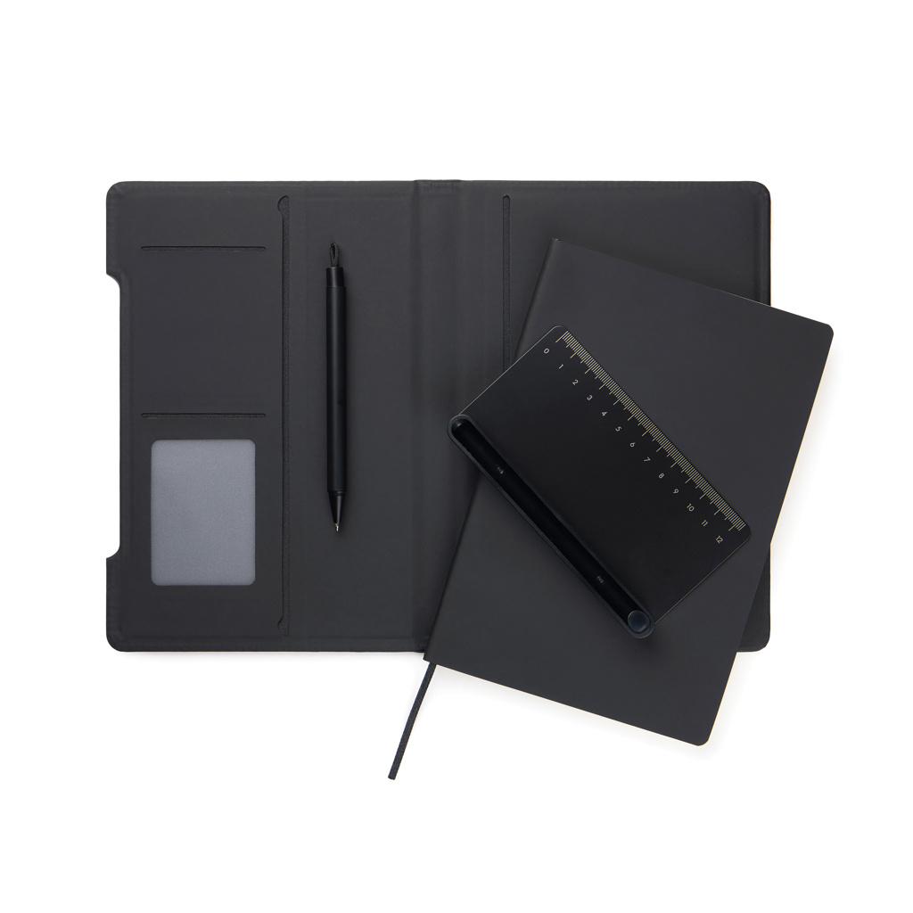 Tutustu monikäyttöiseen muistikirjaan, joka on suunniteltu tukemaan päivittäistä työskentelyäsi. Tämä älykäs 4-in-1-ratkaisu yhdistää käytännöllisyyden, joustavuuden ja muotoilun yhteen tuotteeseen. Valmistettu RCS-sertifioidusta kierrätetystä paperista ja viimeistelty klassisella Baltimore-mattapintaisella PU-pinnoitteella, tehden siitä sekä tyylikkään että toimivan. Magneettinen viivain toimii sekä viivaimena että kynätelineenä ja sisältää sinimusteisen kuulakärkikynän. Kynäteline muuntuu helposti integroiduksi puhelintelineeksi. Sisäpuolella on korttitaskut sekä helposti vaihdettava muistikirjasivuosa pitkäaikaiseen käyttöön. Muistikirja sisältää 80 arkkia / 160 viivoitettua sivua, tarjoten runsaasti tilaa muistiinpanoille ja suunnittelulle. Kierrätysmateriaalin osuus 70 %. Sertifioitu Control Union, CU1162221.
