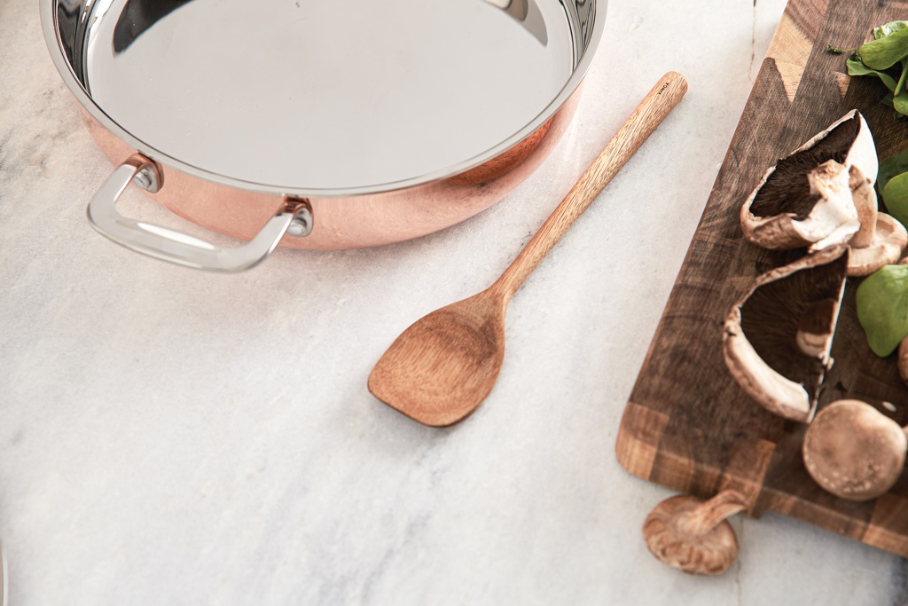 Kannellisessa kolmikerrosperiaatteen mukaisesti valmistetussa upeassa pannussa yhdistyvät perinteet, kauneus ja helppokäyttöisyys! Kaunis ulkopinta on kuparia, sydänosa hyvin lämpöä johtavaa alumiinia ja sisäpinta paistamiseen ja kovaan lämpöön hienosti soveltuvaa ruostumatonta terästä. Pohja on paksu ja tuote soveltuu kaikille liesityypeille. Soveltuu myös uuniin. Kahva on valmistettu rosterista.