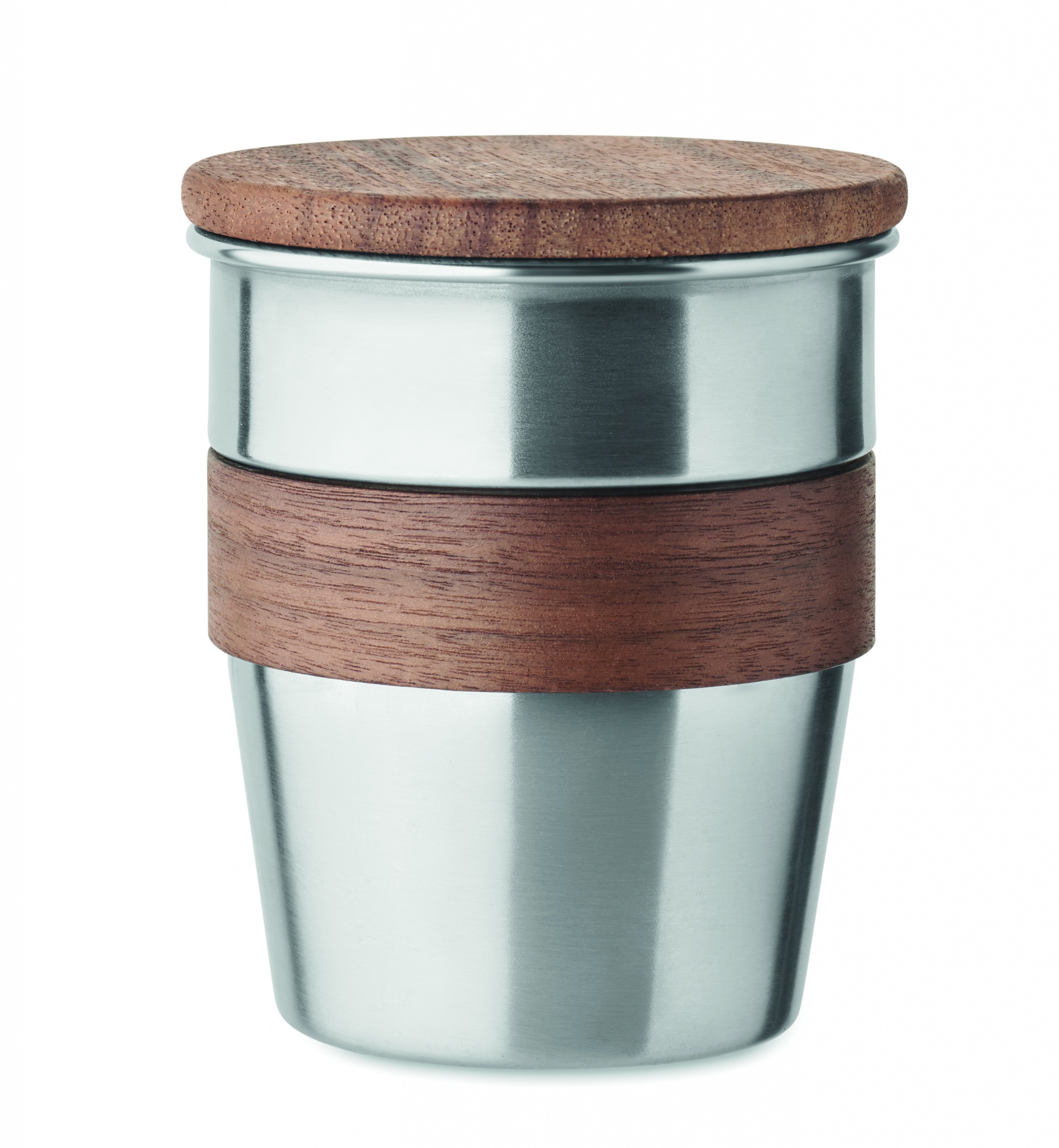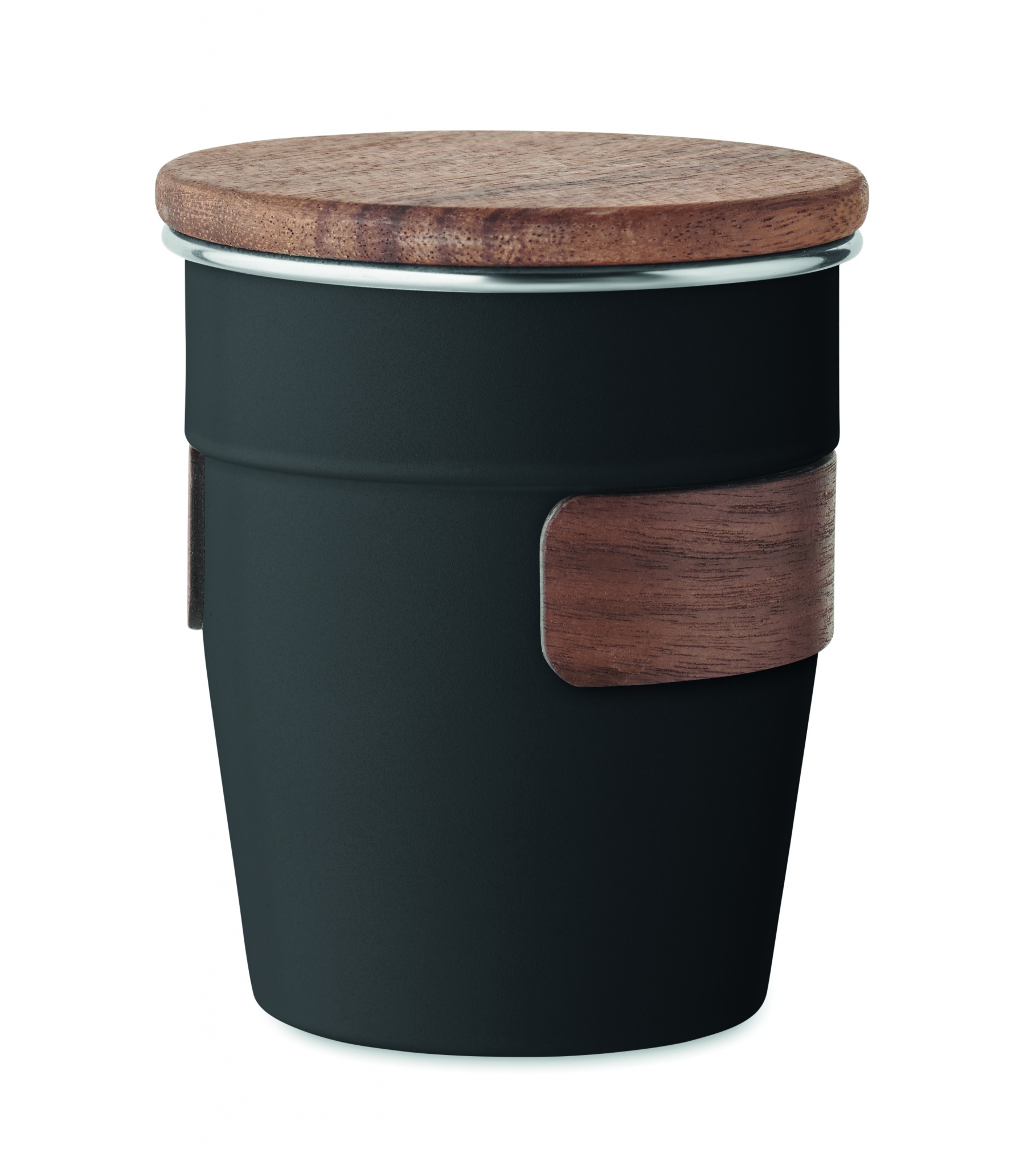 Yksiseinäinen juomamuki kierrätettyä ruostumatonta terästä (90 % kierrätettyä ruostumatonta terästä ja 10 % ruostumatonta terästä) pähkinäkahvalla ja kannella. Tilavuus: 350 ml. Poista kahva puhdistusta varten. Koska tämä on yksiseinäinen muki, lämmönsiirto voi silti ta