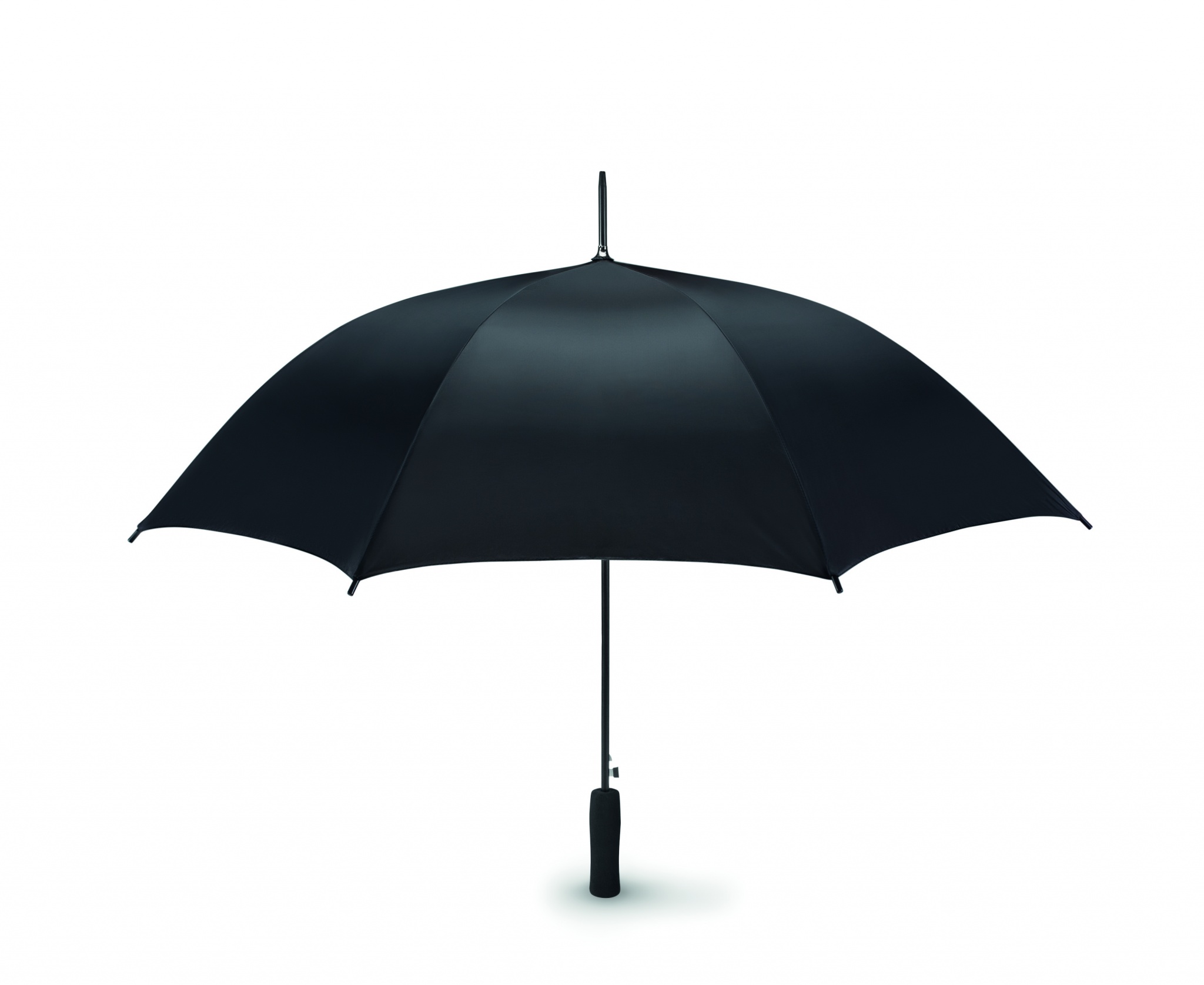 23 colių automatiškai atidaromas skėtis 190T ponge su juodu metaliniu kotu ir briaunomis. Juodos spalvos plastikiniai antgaliai. Tiesi juoda EVA rankena. Rankinis uždarymas.