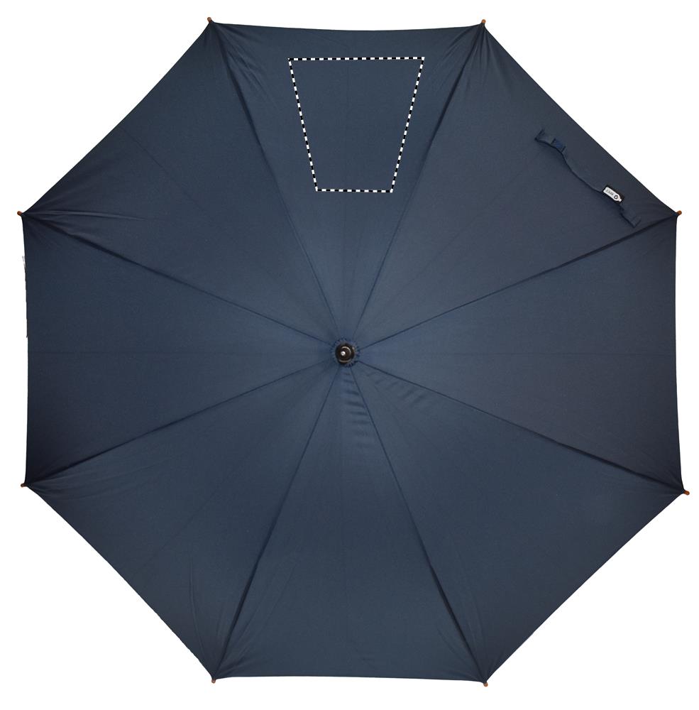 23 colių automatiškai atidaromas skėtis iš 190T RPET su mediniu kotu, antgaliais ir viršumi. Juodai dengti metaliniai šonkauliai. Lenkta natūralios apdailos medinė rankena. Rankinis uždarymas.