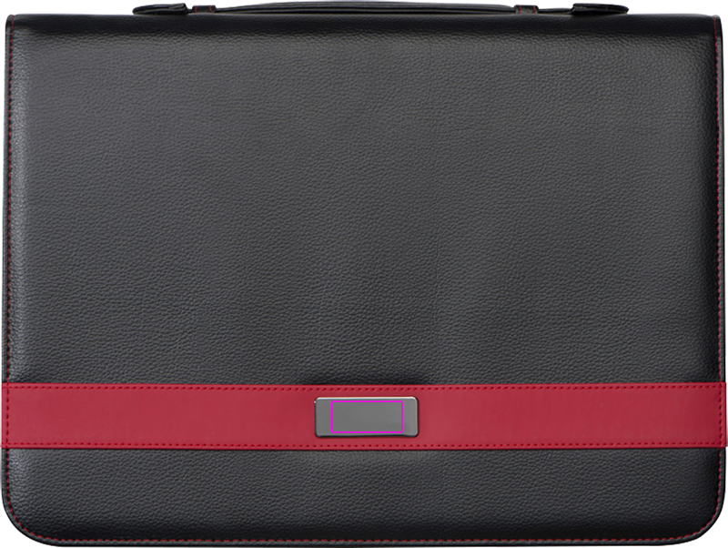 A4 formato dėklas su puikia Bonded Leather (odos pluošto audinys), įvairiomis guminėmis kilpomis ir kišenėmis, žiediniu segtuvu, rašymo bloknotu (60 puslapių), planšetinio kompiuterio / išmaniojo telefono laikikliu, mobiliojo telefono kišene, nešiojimo rankena ir užtrauktuku. Jūsų logotipas bus išgraviruotas lazeriu metalinės plokštės išorėje.