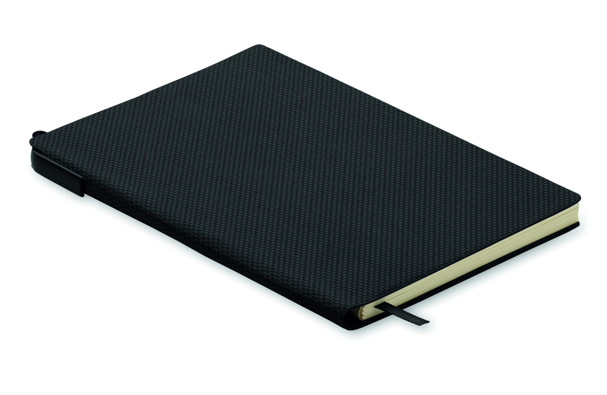 A5 formato užrašų knygelė su struktūriniu PU dangteliu su ABS sukamu rutuliniu rašikliu, esančiu nugarinėje rašiklio laikiklyje. Byla surišta. 160 linijuotų puslapių perdirbto popieriaus (80 lapų).