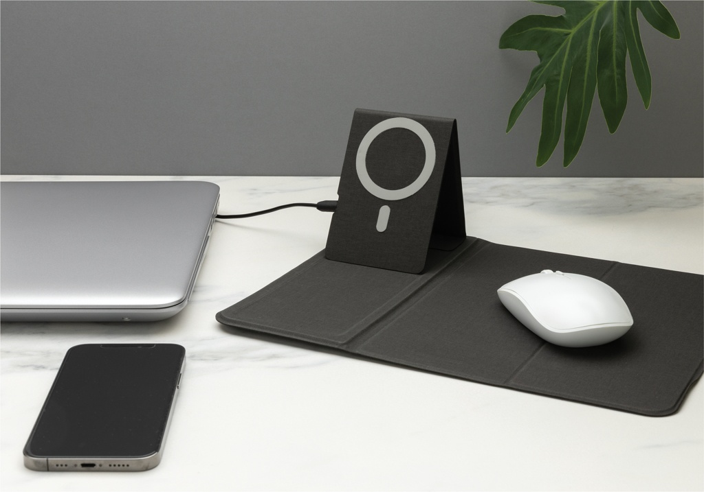 Plokščias ir sulankstomas 10 W belaidžio įkroviklio pelės kilimėlis. PU medžiagos įkroviklis gali būti naudojamas ir plokščias, ir kaip stovas. Visą pelės kilimėlį galima sulankstyti, todėl jį lengva neštis bet kur. 10 W belaidis įkroviklis suderinamas su visais QI įrenginiais (Iphone 8 ir naujesniais bei Android įrenginiais) C tipo įvestis 9V/2A; Belaidis išėjimas 9V/1.1A; Type-C išėjimas 9V/2A; Įskaitant TPE įkrovimo laidą be PVC. Integruoti 19 vnt aukštos kokybės N52H karščiui atsparūs magnetai. Registruotas dizainas. Įskaitant 120 cm be PVC TPE medžiagos C tipo kabelį. Registruotas dizainas