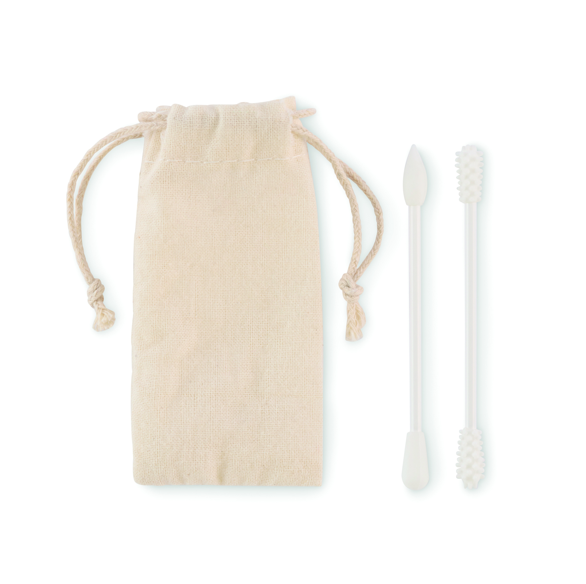 2 daugkartinio naudojimo ir plaunamų silikoninių tamponų rinkinys su 3 skirtingomis galvutėmis. Pateikiamas sutraukiamame medvilniniame maišelyje.