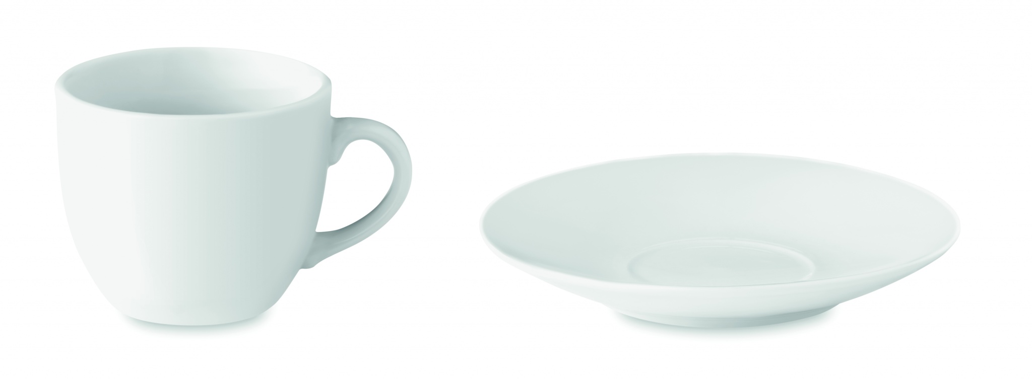 Porcelianinis espreso puodelis ir lėkštė. Puodelio talpa: 80 ml. Masinė pakuotė. Tampografija nėra tinkama plauti indaplovėje. Keraminį perkėlimą galima plauti indaplovėje.
